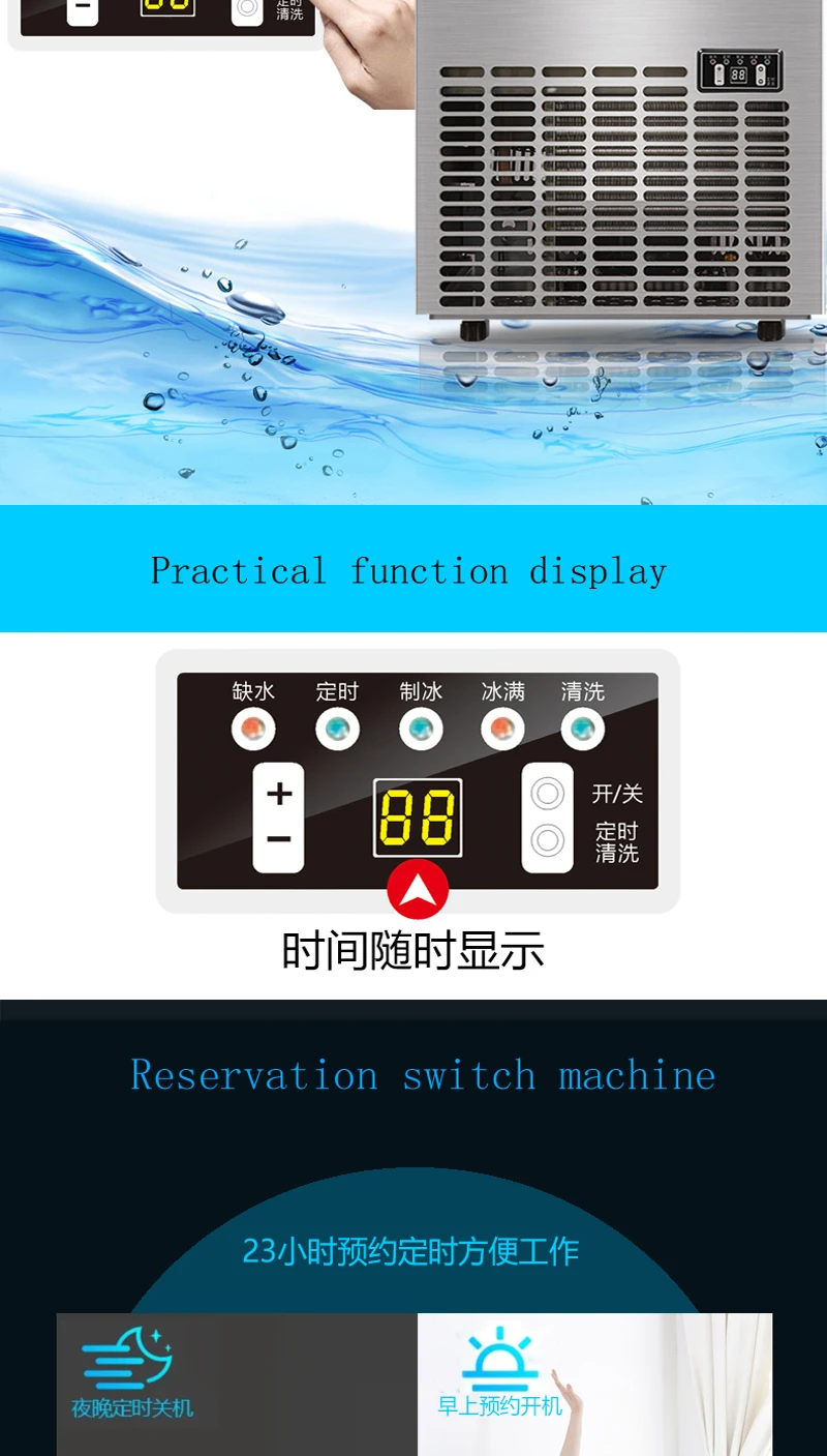 Машина для приготовления льда Модель: HZB-50 / A Напряжение: 220 В Мощность: 200 Вт Форма льда: квадратный лед Время одиночного льда: 10-20 минут Производство: 50 кг/24 ч Емкость для хранения льда: 1580 шт/15 кг Метод забора воды: автоматический Вес машины: 26,7 кг Размер: 448*400*798 мм
