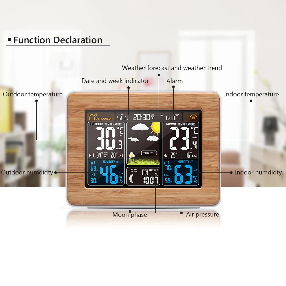 Метеостанция:Продукт может предсказывать погоду, влажность, температуру, барометрическое давление, фазу Луны, ежедневную сигнализацию и функцию повтора. С большим, четсветодиодный светодиодным экраном может показывать всю упомянутую информацию.