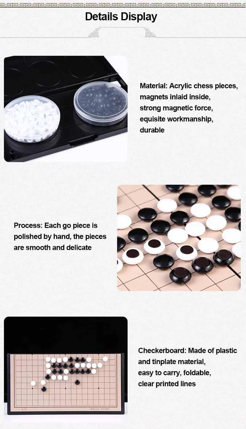 Материал: акриловые шахматные кусочки, инкрустированные внутри магниты, сильная Магнитная сила, изначальное мастерство, прочный процесс: каждый предмет полируется вручную, кусочки гладкие и деликатные шахматные доски: изготовлено из пластика и жести, легко носить с собой, складные, четкие печатные линии