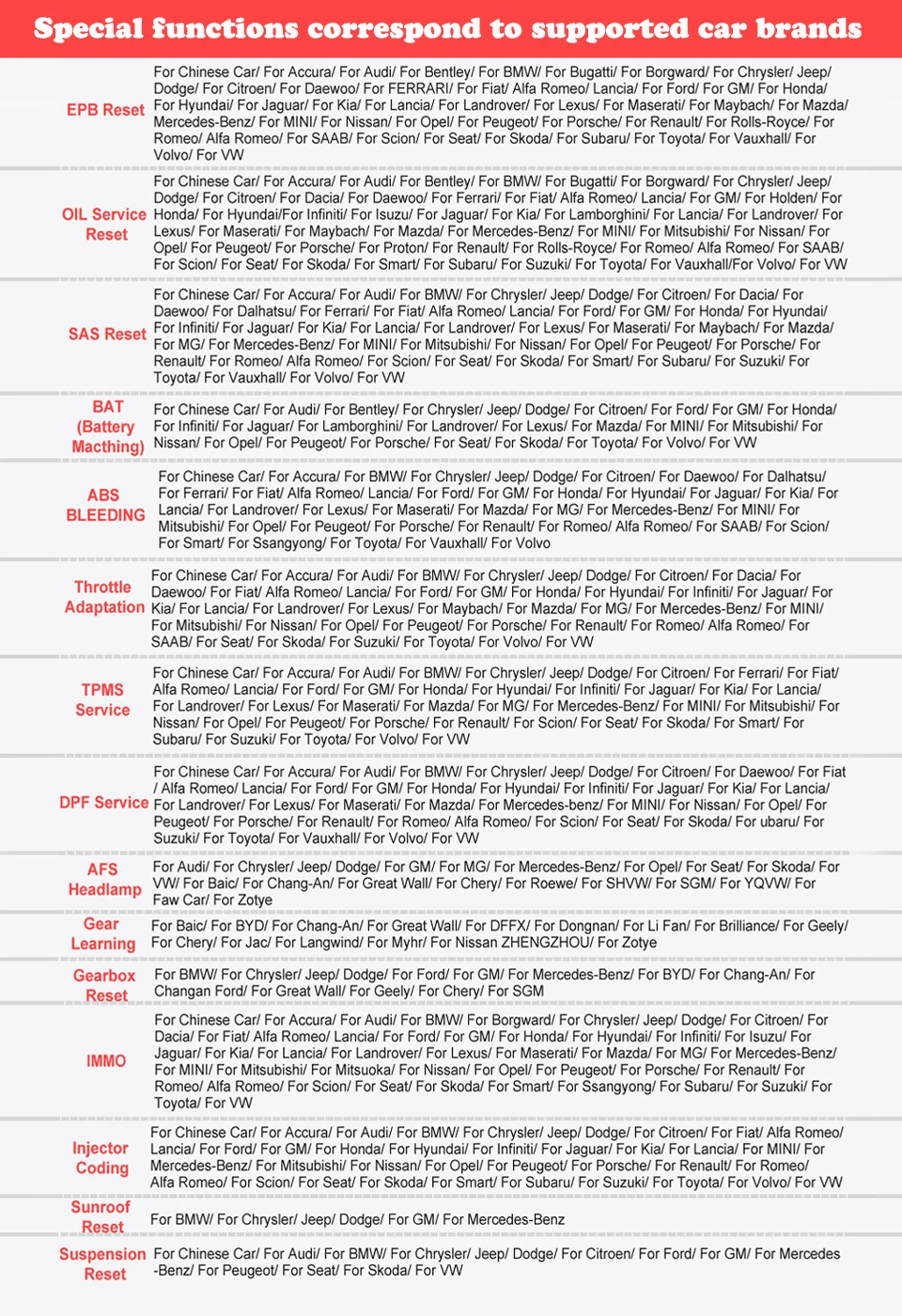 Эти функции OBD2 не применимы ко всем моделям автомобилей. Если вы не уверены, пожалуйста, оставьте сообщение нашей службе поддержки клиентов и пришлите мне ваш автомобильный бренд, модель и год выпуска, или пришлите мне ваш автомобильный код, И я помогу вам узнать, поддерживает ли автомобиль