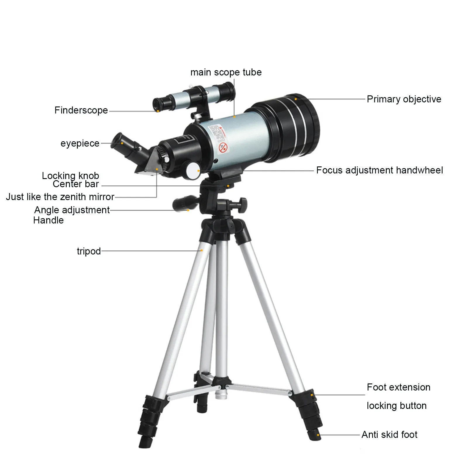 Это небольшой астрономический телескоп с преломлением с преимуществами большего диаметра (70 мм) и низкой ценой. Он не занимает место и подходит для начинающих астрономов. Он оснащен 2 окулярами с различными увеличениями и увеличением 1,5x. Зеркало. Он позволяет свободно сочетать и наблюдать предметы разных расстояний и размеров.