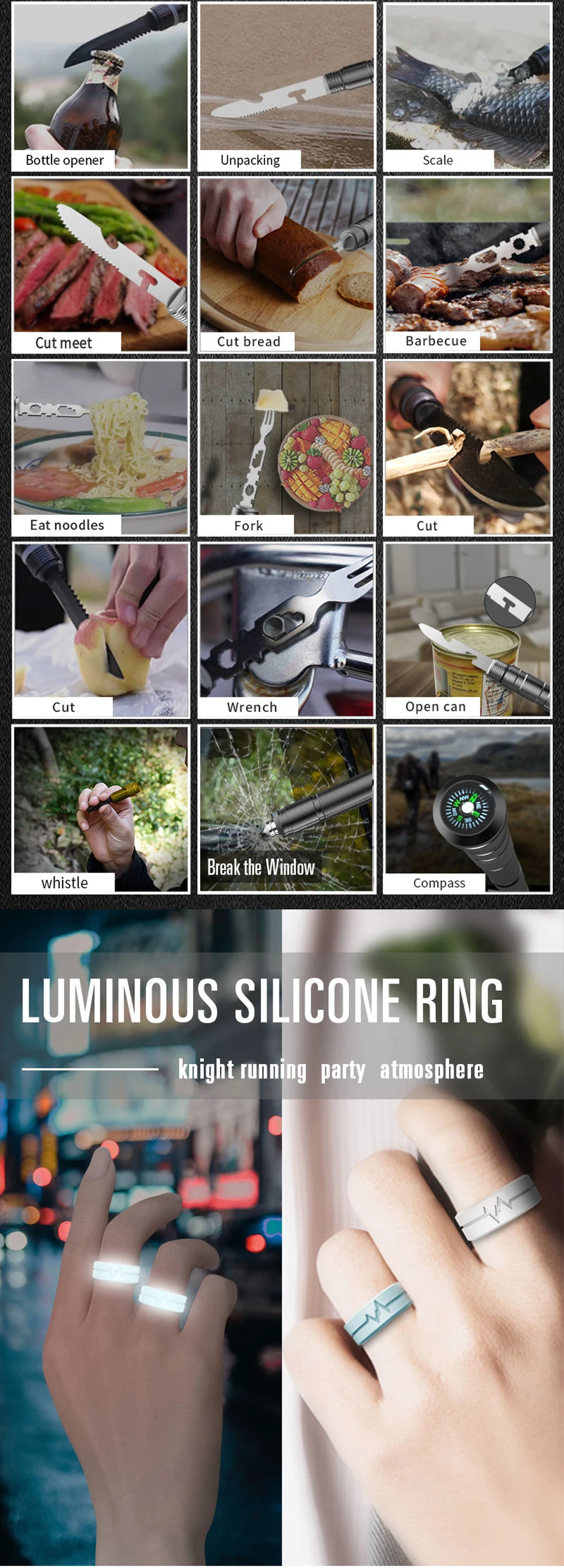 1. Многофункциональный вспышки светильник: выдвижная конструкция, есть три светильник ing методов (флеш-накопитель светильник, используемый для прогулок ночью, освещения дороги, масштабирование; Походный светильник, ночной кемпинг может использоваться для освещения, предохраняет безопасность; Предупреждающий светильник, красный светильник может быть излучаемым сигналом опасности, используется для предотвращения опасности и используется для спасения. ) 2. Головка лопаты, складной метод преобразования имеет различные цели; Например: раскопки, распиловка, резка, полевая защита. Головка лопаты съемная и может быть преобразована в топор или кирку, которая используется для вырубки, точения, фиксации, резки растительности или веревки, и т. Д. Она предназначена и производится для любителей кемпинга на открытом воздухе. 3. Ручка лопаты, инновационный и компактный процесс накатки, более удобно держать и улучшает ощущение руки. Уникальное сочетание разборки и сборки может быть безопасно преобразовано и использовано в различных формах для защиты безопасности. 4. Многофункциональный тактический топор (топор + хвостовый серп) Многофункциональная тактическая Кирка (Пилообразная Кирка + хвостовый серп) 5. Первый встроенный конус для атаки может легко сломать окно, а также может использоваться для самозащиты.