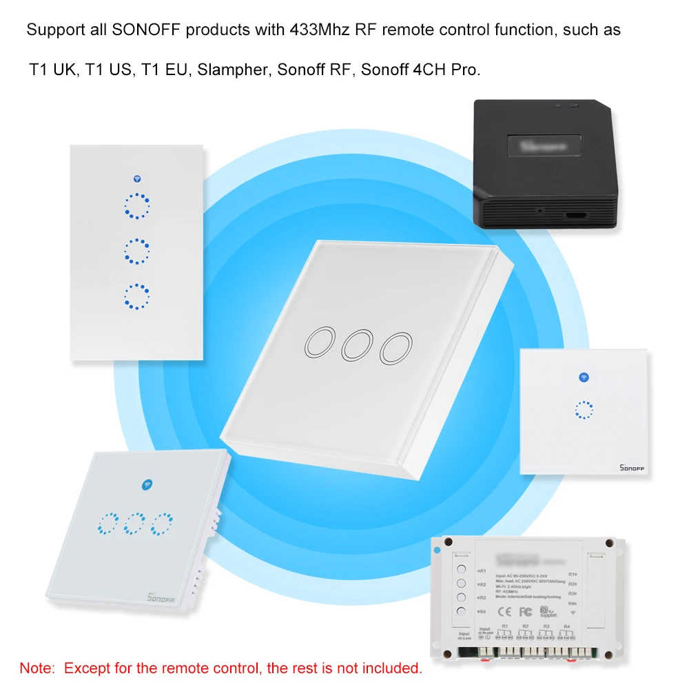 * 2CH может управлять 2 различными устройствами. Поддержка всех продуктов SONOFF с функцией радиочастотного дистанционного управления 433 МГц, таких как T1 UK, T1 US, T1 EU, Slampher, Sonoff RF, Sonoff 4CH Pro.