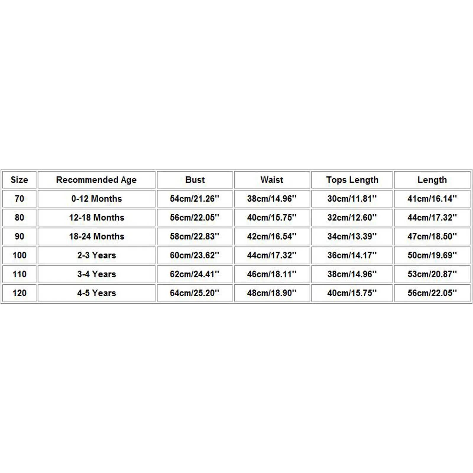 Размеры Рекомендуемый возраст Бюст Талия Длина топа Длина 70 0-12 месяцев 54 см/21,26'' 38 см/14,96'' 30 см/11,81'' 41 см/16,14'' 80 12-18 месяцев 56 см/22,05'' 40 см/15,75'' 32 см/12,60'' 44 см/17,32'' 90 18-24 месяцев 58 см/22,83'' 42 см/16,54'' 34 см/13,39'' 47 см/18,50'' 100 От 2 до 3 лет 60 см/23,62'' 44 см/17,32'' 36 см/14,17'' 50 см/19,69'' 110 От 3 до 4 лет 62 см/24,41'' 46 см/18,11'' 38 см/14,96'' 53 см/20,87'' 120 От 4 до 5 лет 64 см/25,20'' 48 см/18,90'' 40 см/15,75'' 56 см/22,05''