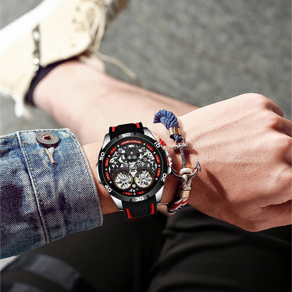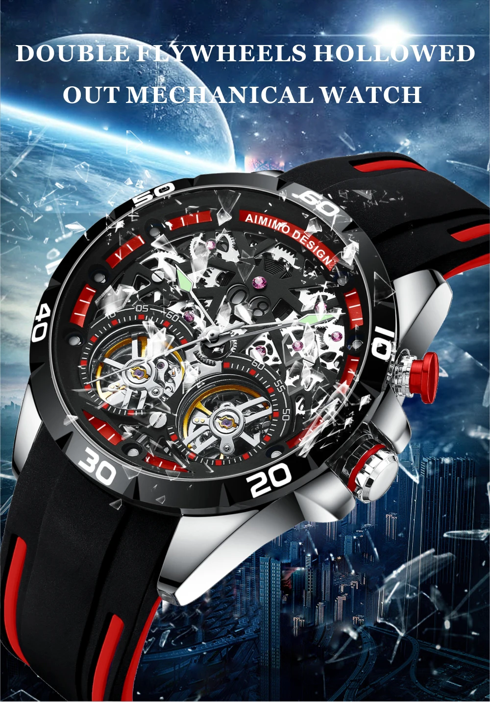 AIMIMO DESIGN Men's Watch Double tourbillon Watch Automatic Hollow-out Machine Watches Men Luminous Waterproof 30M Clock Relogio