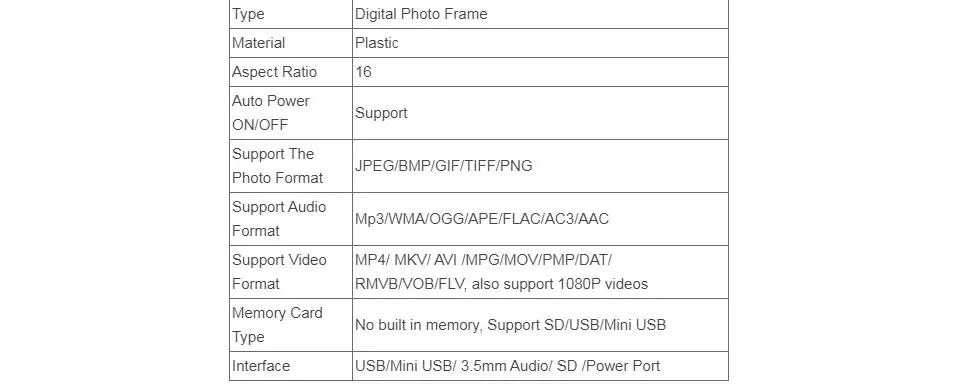 Характеристики продукта HD IPS-дисплей: IPS-экран цифровой фоторамки позволяет получить отличный опыт просмотра при любом разрешении angle.1024x600 может по-настоящему отображать цвета и детали фото и видео. Предварительный просмотр изображений и слайд-шоу: Эта 10-дюймовая цифровая фоторамка имеет уникальную функцию предварительного просмотра изображений, которая удобна для вас для поиска определенного изображения из сотен. Цифровая фоторамка позволяет настроить различную скорость перехода, эффекты перехода и режим повтора. С фоновой музыкой: вы можете скачать любимую музыку на SD карту. Когда вы наслаждаетесь своей фотографией, концерт подарит вам более приятную атмосферу, он также имеет 3,5 мм разъем для наушников. Plug and Play: Включите питание, подключите SD-карту/U-диск, цифровые кадры будут автоматически воспроизводить фотографии. Нет сложной операционной системы, проста в использовании. Несколько функций: в качестве фото/аудио/видео проигрывателя эта цифровая фоторамка также поставляется с функциями часов и календаря. Цифровая фоторамка поддерживает видео файлы JPEG/BMP/PNG и 720P и 1080P. Умная Электронная рамка для фотографий делает вашу жизнь легкой и простой, и это лучший выбор для подарка Вашим родным и близким. Спецификация продукта