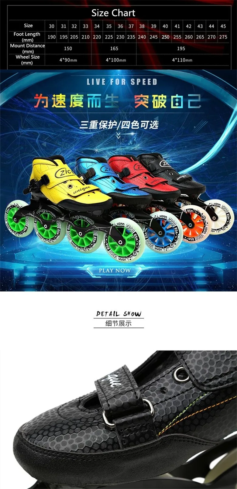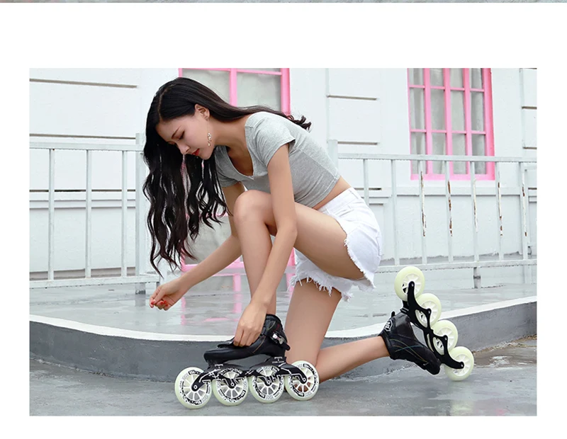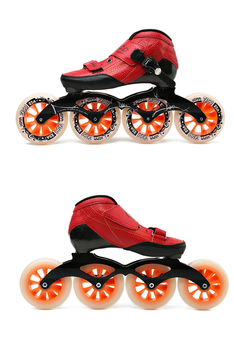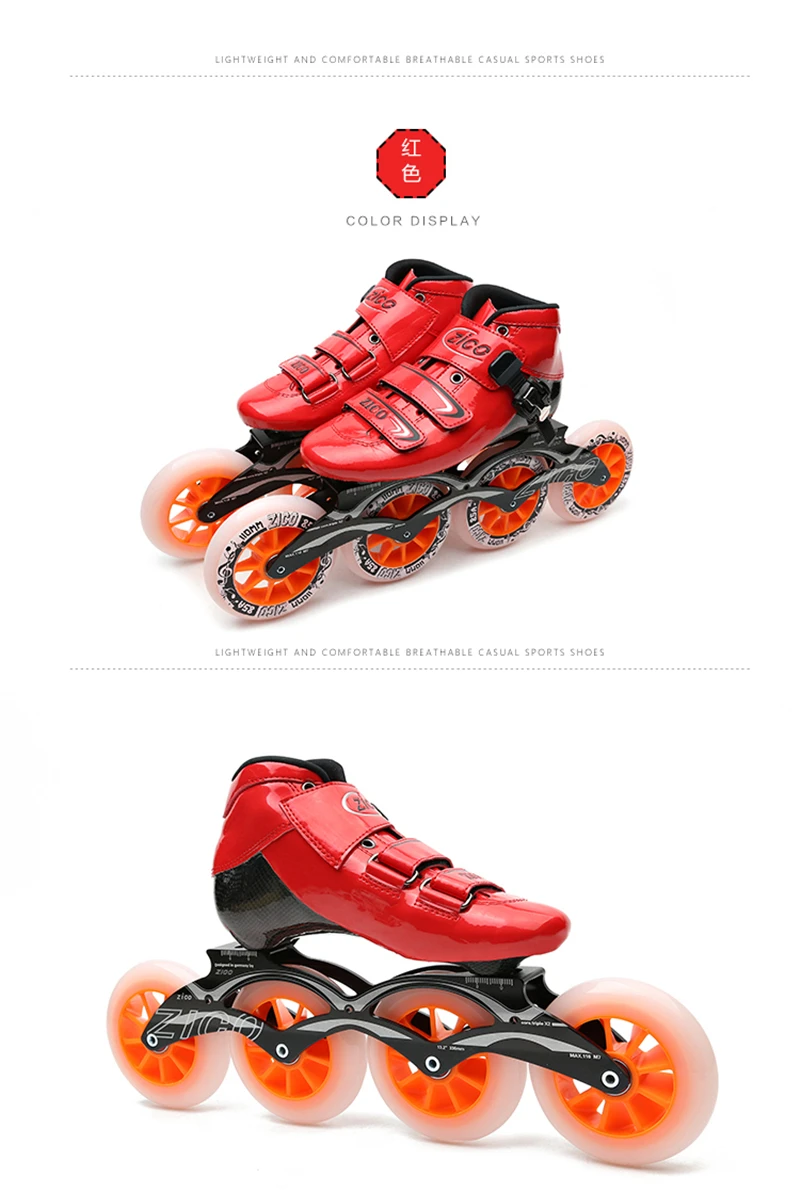 Скоростные коньки изготовлены из светильник и усиленного карбонового волокна; Колесо изготовлено из прочного и эластичного полиуретана 85A; Подшипник гладкий и менее устойчивый; Поверхность ботинка имеет гладкий и грубый вариант, они имеют такое же хорошее качество и цену.