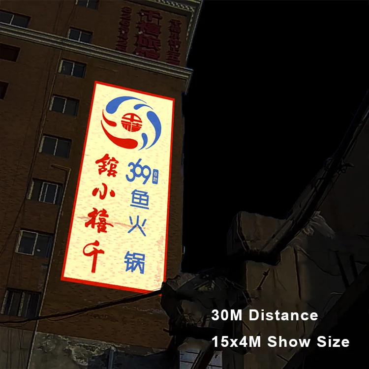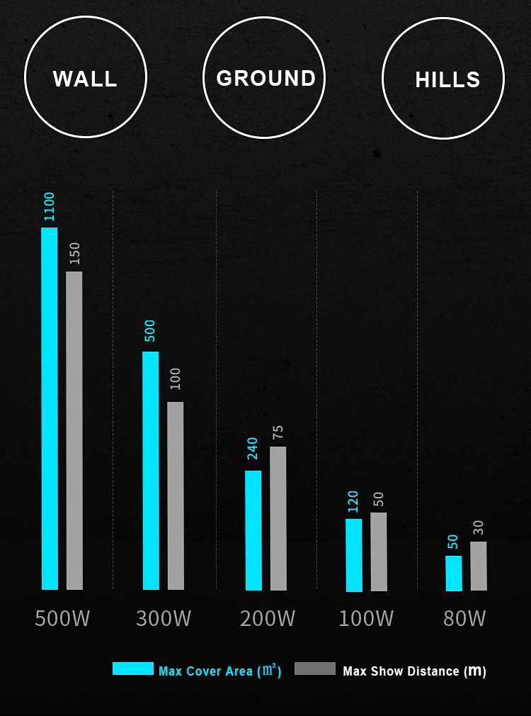 О: мощность проектора gobo зависит в основном от расстояния/площади и окружающей среды, которую вы планируете использовать, вы можете обратиться к картинке ниже. (Весь светодиодный проектор не рекомендуется использовать в дневное время, особенно под солнцем)