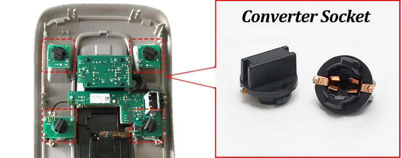 Посылка включает в себя: Передняя Карта/купольный светильник (4 шт.) + (конвертерные розетки x 4) Задняя карта/купол (2 шт.) + (конвертерные розетки x 2) Туалетный зеркальный светильник (4 шт.) Светильник для перчаток (1 шт.) Светильник багажника (1 шт.)