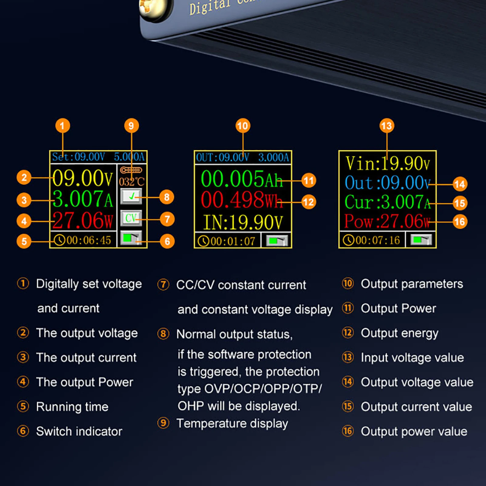 Программируемый цифровой управляемый понижающий источник питания постоянного тока DC6006L имеет небольшие размеры, полный входной интерфейс, стабильную производительность, высокую точность и высокую эффективность и содержит различные настройки гуманизированной системы. В нем используется 1,44 дюймовый ЖК-дисплей высокой четкости, который отображает различные данные на одном экране, а страница простая и насыщенная.
