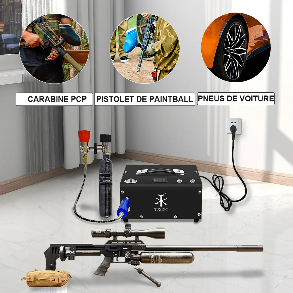 Наш портативный воздушный компрессор PCP спроектирован с тремя безопасными устройствами: регулируемым манометром, запорным клапаном и разрывным диском, что делает компрессор более безопасным. Идеально подходит для пневматической винтовки PCP, Пейнтбольного танка, мини-резервуара для дайвинга и т. д.