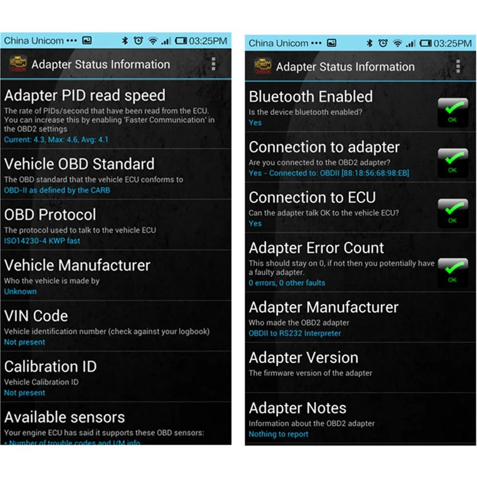 • Чтение диагностических кодов неисправностей, как общих, так и конкретных производителей, и отображение их значения (более 3000 общих кодов в базе данных).