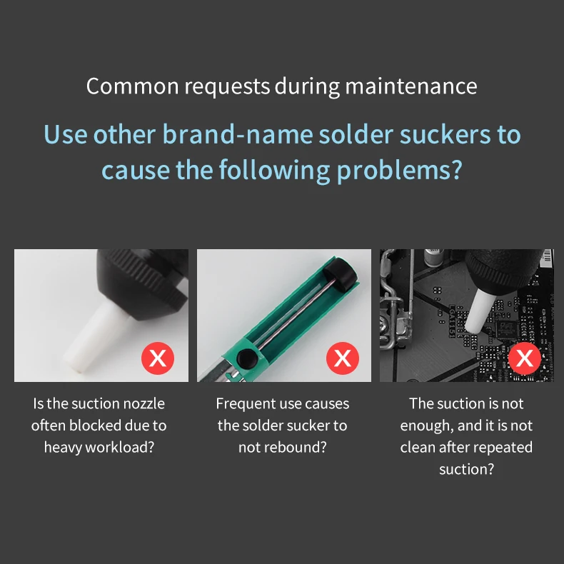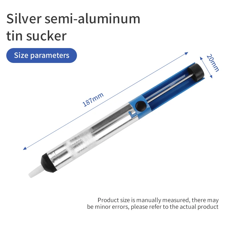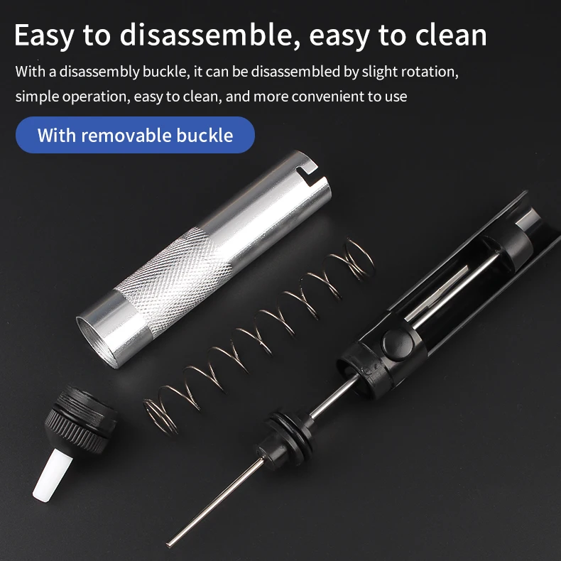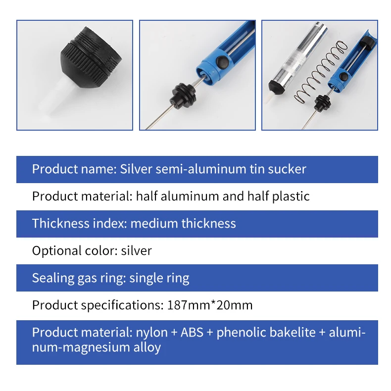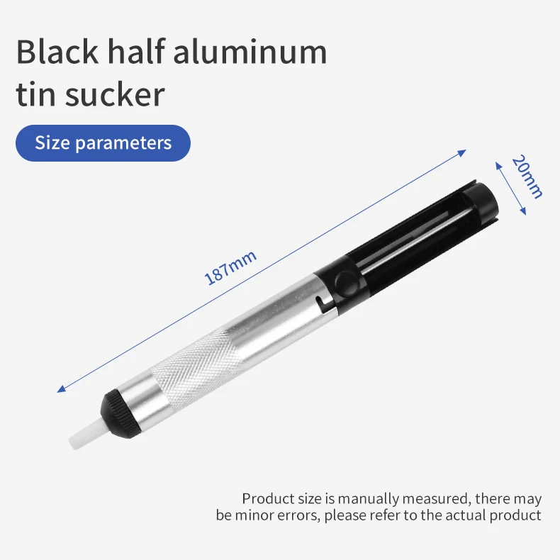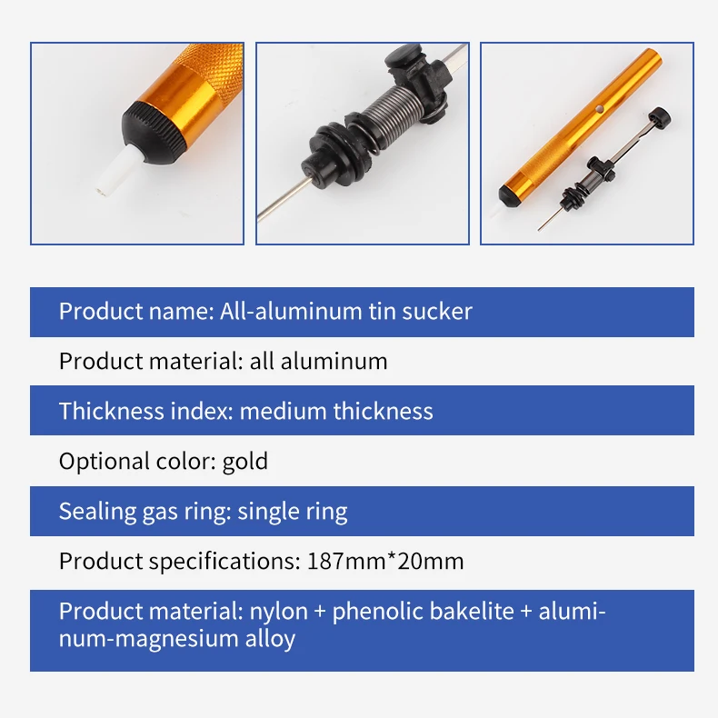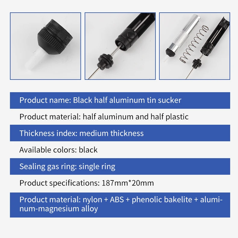 Характеристика:• Отличная производительность: сильное всасывание, антистатическое, легко моется, сменный наконечник.• Анти-засорение: длинная наперсток может эффективно предотвратить частое использование для блокировки всасывающего сопла.• Высокотемпературная жестяная присоска: насадка для клея из отличного нейлонового материала более устойчива к температурам, чем обычные клеевые насадки.• Мощная присоска для припоя: с вакуумом высокого давления, который помогает эффективно удалять припой.• Компактный и легкий: легко носить с собой, демонтажный насос можно использовать одной рукой, правой или левой рукой.Спецификация:Материал: половина алюминия и половина пластика/весь алюминийЦвет: синий/черный/золотойУплотнительное газовое кольцо: одно кольцоРазмер: 187 мм * 20 ммВес: около 40 гКак использовать:1. Нажмите на присоске с большим пальцем, пока не услышите звук нажатия;2. Используйте Электрический паяльник для нагрева паяльных соединений до расплавления припоя;3. Извлеките паяльник, поместите всасывающее сопло на припой, не оставляя зазора, и нажмите кнопку отскока;4. После очистки всасывания удалите Электрический паяльник и устройство всасывания олова.Посылка включает в себя:1 х насос для демонтажа