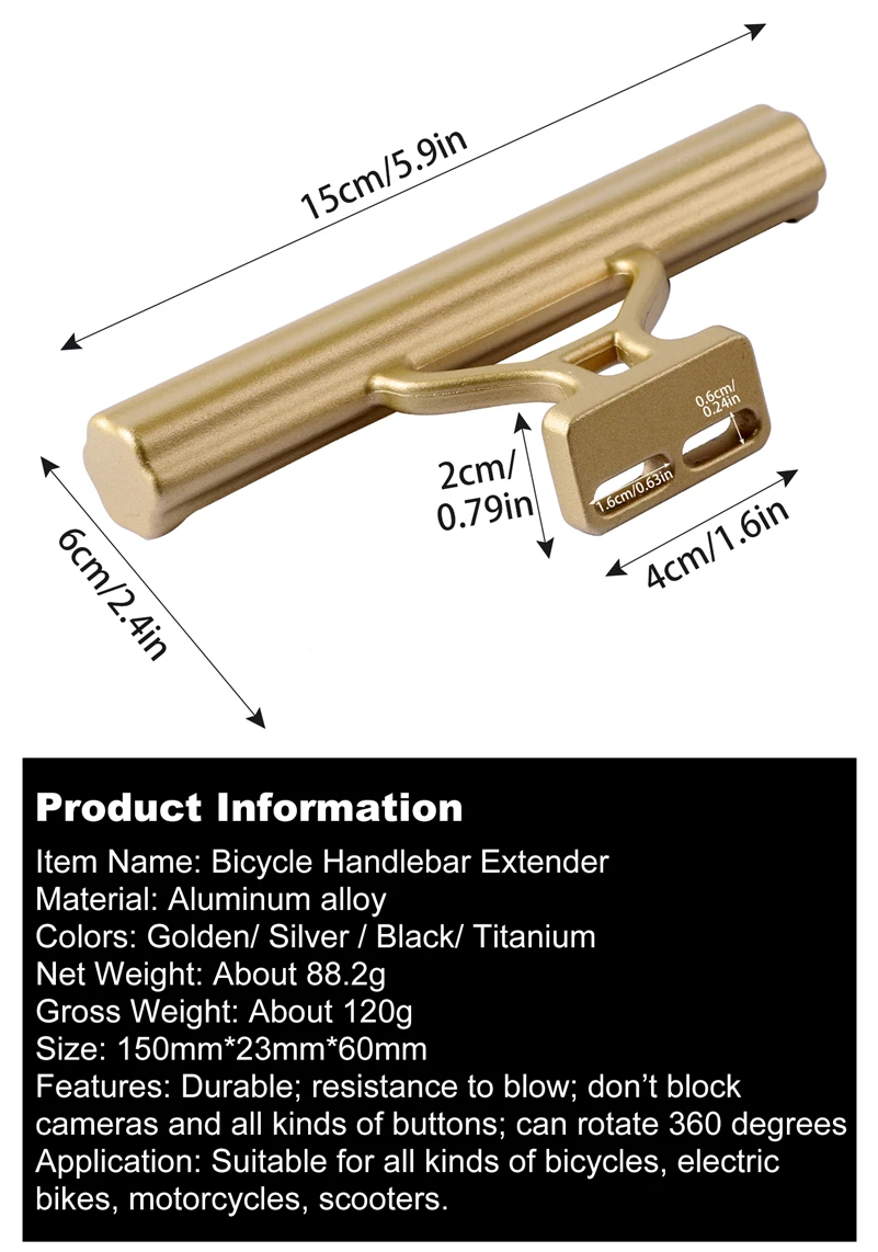Информация о товареНазвание товара удлинитель руля велосипедаМатериал алюминиевый сплавЦвета золотой серебряный черный титанВес нетто около 88,2 гВес брутто около 120 гРазмер 150 мм23 мм60 ммОсобенности долговечность; Устойчивость к продуванию; Не блокируют камеры и всевозможные кнопки; Может поворачиваться на 360 градусовПрименение Подходит для всех видов велосипедов, электровелосипедов, мотоциклов, скутеров.