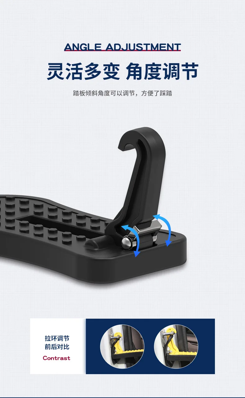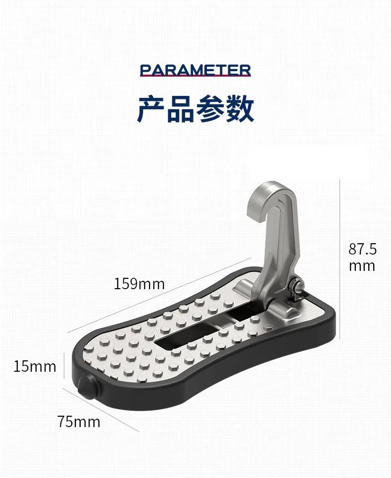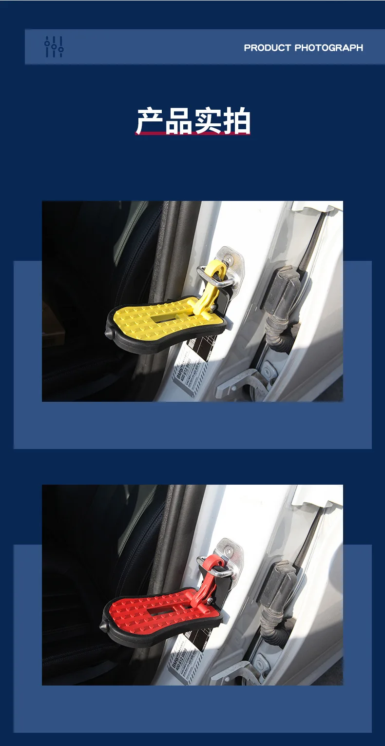 Features: 1. Safe Door Step for Your Car: With the design of multiple soft rubber buffer protection pads, no worry about the damage of the paint at the attachment point, nor will it cause door frame denting. 2. High quality door step for car roof: Die-cast aluminium construction ensures durability and longevity. The beefy hook can offers a weight capacity of 400lbs.The raised surface make it sturdier/non-slippery even in wet shoes. 3. Gives excellent height: Making access to car roof easy, it is a huge plus for installing your cross rails and vehicle racks, loading or unloading your ship, kayak, skis, bicycle, camping, surfing board. It even reduces the mess in your car from tracking in snow. 4. Universal car step: Adjustable angle bearing design make the door step horizontal in both straight and curved door jam.It is universal and will fit all vehicles, SUV, jeep, Subaru, wrangler, cherokee, chevy, toyota, both front and rear doors. 5. Multifunctional and compact vehicle folding ladder: With the foldable, portable design, the car door step can be stored away anywhere in your car. It can also be used as a safety hammer and wheel anti-skid device in case of emergency.