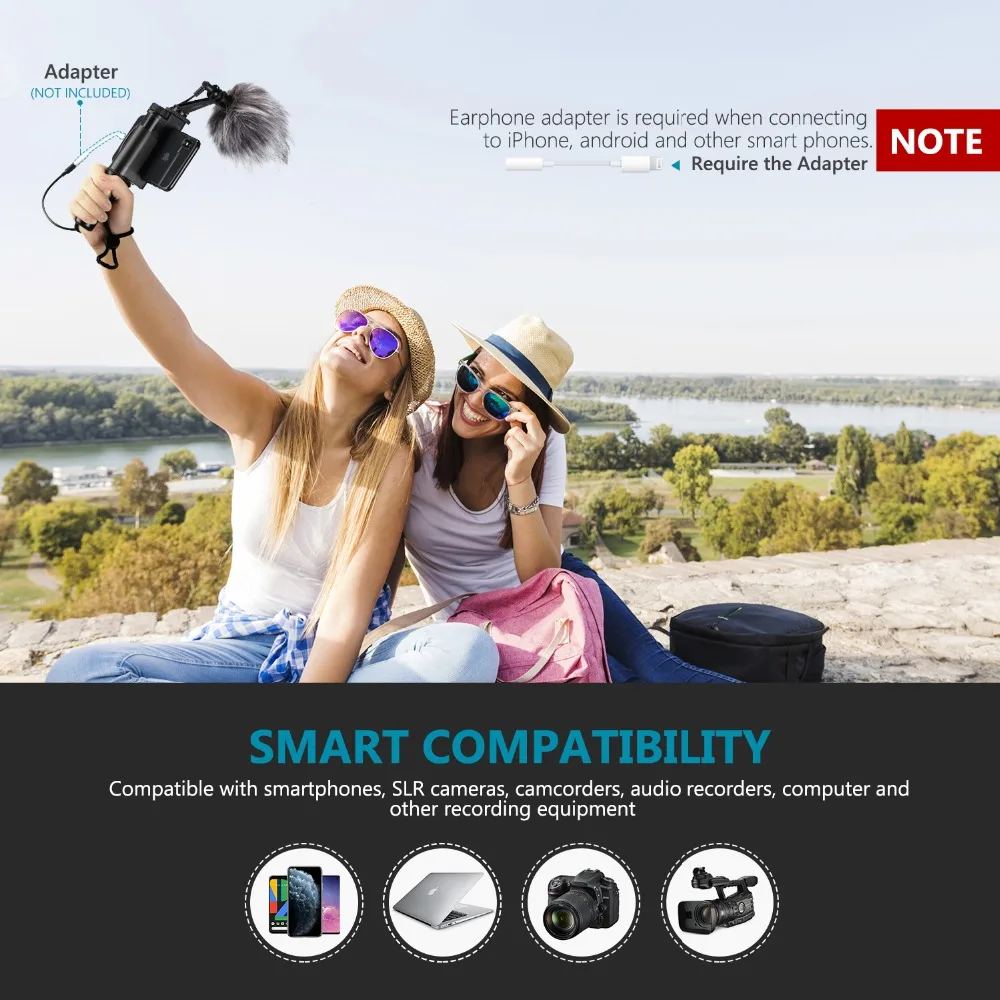 Plug-and-Play: подключения микрофона к youroldiPhoneor Android телефон (with3.5mm аудиоразъемом) накопленном в комплекте 3,5 мм TRS до TRRS аудио-кабель. Для перехода от разъема Lightning к 3,5 мм разъем для наушников Adapteris в комплекте для новых моделей iPhone без 3,5 мм аудио разъем