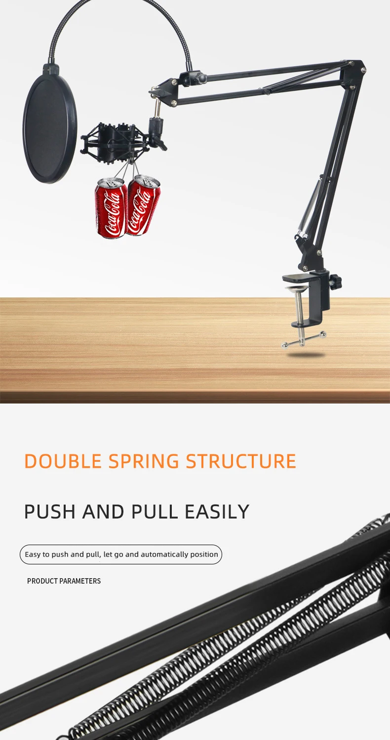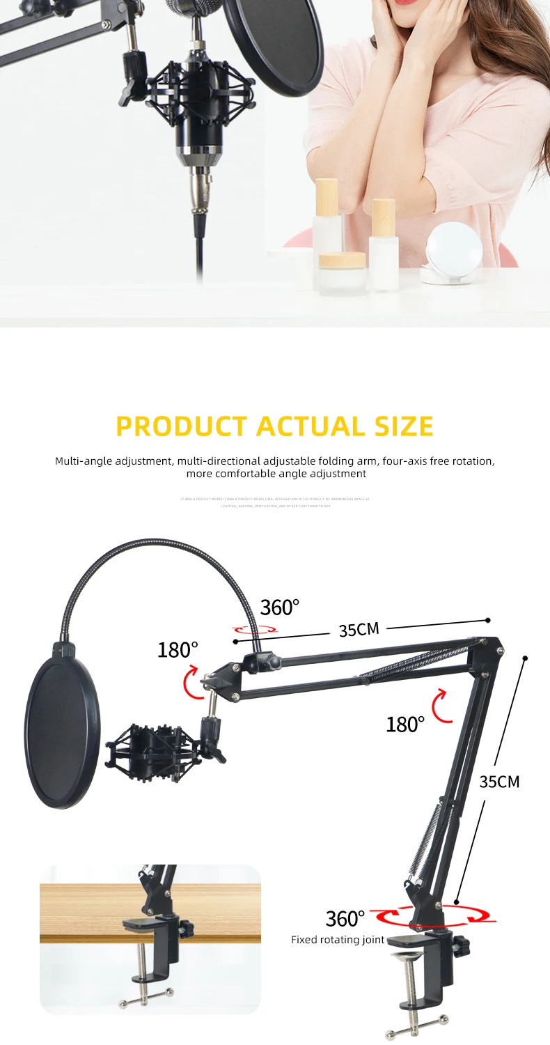 1. Регулировка угла, подходит для различных типов микрофонов, легко и быстро устанавливается и разгружается, стабильная и нескользящая, не трясется. 2. Многоугольная регулировка, многонаправленная Регулируемая Складная рукоятка, четыре оси свободного вращения, более удобная регулировка угла. 3. Оснащен металлическими настольными зажимами, большими мембранными ударными креплениями, защитными зажимами, универсальными резьбовыми головками, повышенной несущей способностью 4. Двойная пружинная структура для легкого нажатия и тяги. 5. Складной, легко носить с собой, больше подходит для различных случаев.
