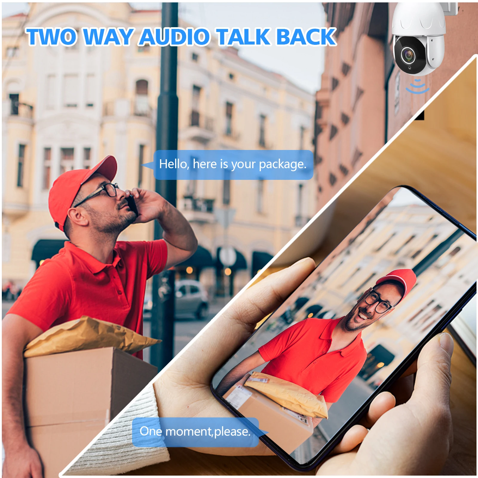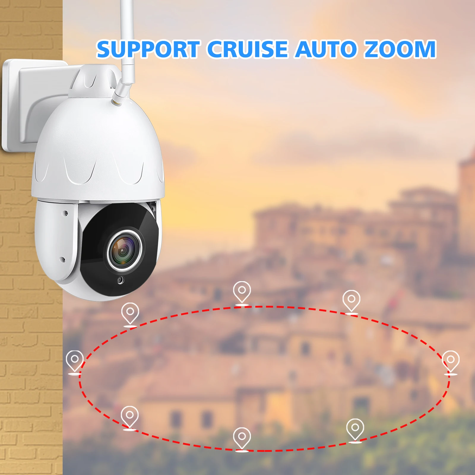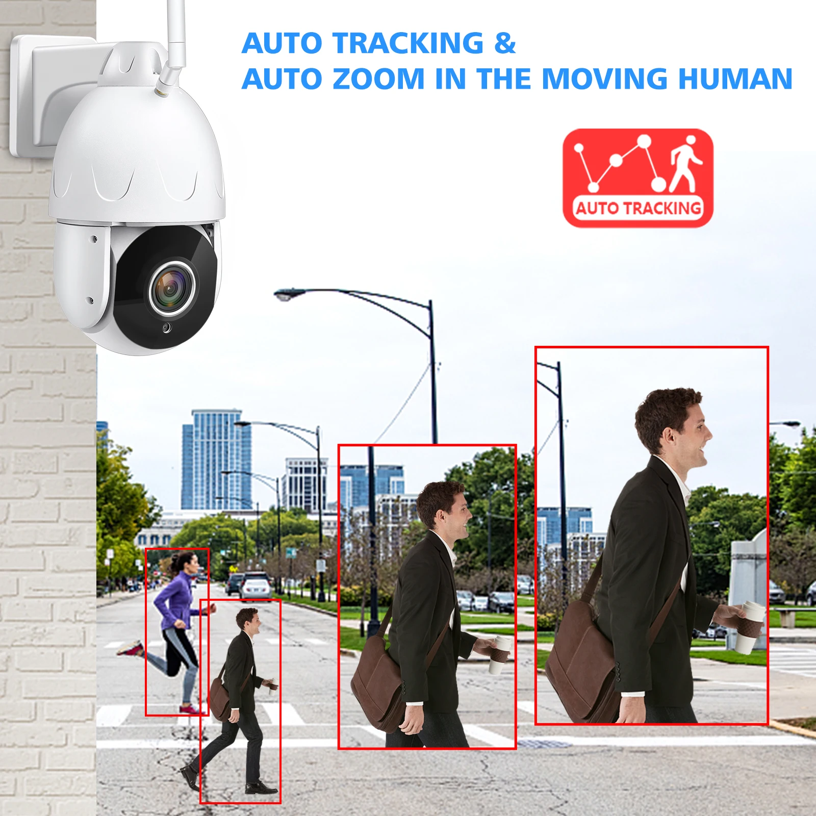 Камера будет регулировать панорамирование/наклон вращения и масштабировать автоматически, захватывая четкие цели мониторинга и автоматическое отслеживание движения человека, а также push-оповещения по электронной почте или уведомления на телефон.