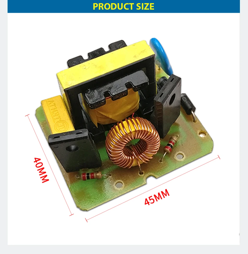 Этот продукт представляет собой 4-го поколения повышающего модуля и повышающего трансформатора. Вход 12 В постоянного тока, а другой конец может получить напряжение 220 В переменного тока и 220 В постоянного тока. Частота Высокая и выходная мощность большая, которая может управлять энергосберегающими лампами мощностью 40 Вт.