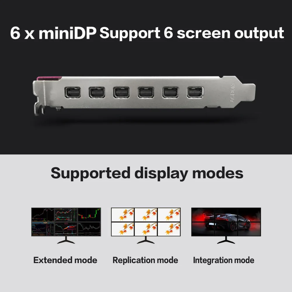 6 портов miniDP поддерживают отображение разделенных экранов, обеспечивают бесплатное сочетание из 6 экранов, вы можете свободно регулировать между расширенным режимом, режимом репликации и режимом интеграции.