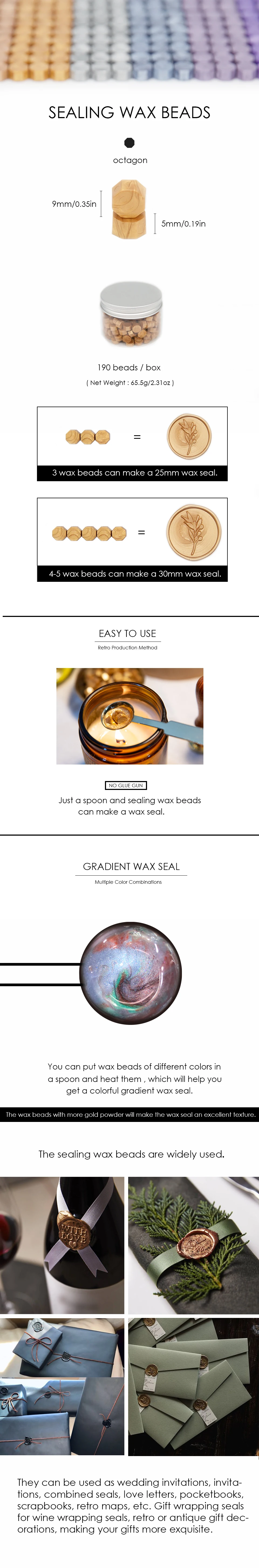 Эти уплотнительные восковые бусины формируются вручную в крошечные уплотнительные капельки воска. Уплотнительные восковые бусины очень просты в использовании: аккуратно расплавьте в ложке над пламенем и налейте непосредственно на поверхность, прежде чем произвести впечатление воскового уплотнения. Цвета могут быть смешаны для создания мраморных восковых уплотнений.