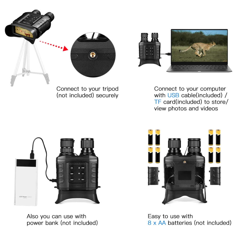 Это цифровое ночное устройство предназначено как для дневного, так и для ночного использования. Он имеет несколько функций, таких как фото, видео и воспроизведение. Оптический зум X20 и цифровой зум 4X позволяют четко просматривать объекты. С помощью специального инфракрасного осветителя пользователь может видеть дальнюю цель до 500 метров в полной темноте. Он идеально используется для кемпинга, пеших прогулок, спелекания, наблюдения за животными и других ночных мероприятий.