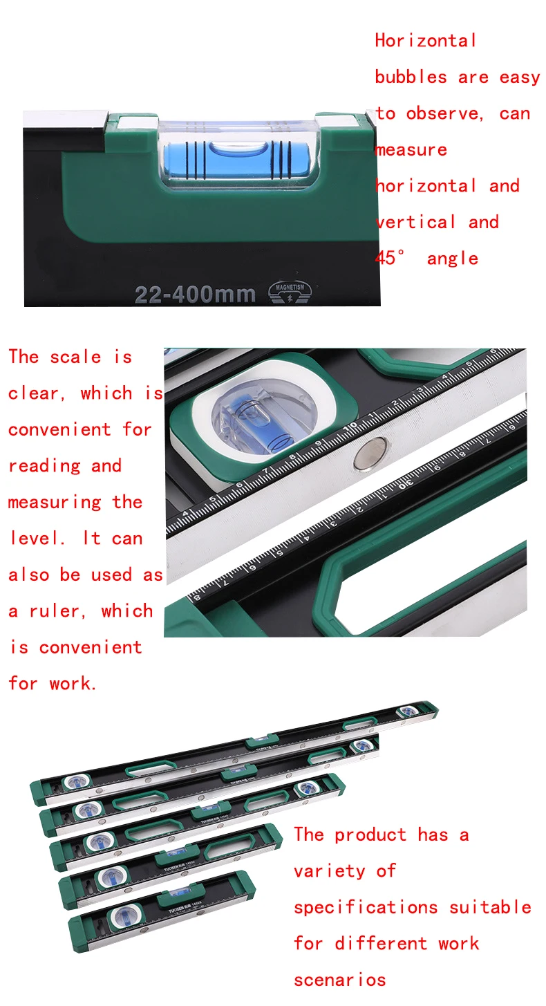 Название; Уровень алюминиевого сплава Продукция 100% Подлинная и надежная по качеству Диапазон измерения: 300-1000 (мм) Точность измерения: мм Использование продукта: измерительный уровень Магнитный: с магнитной Продукт; Три стиля
