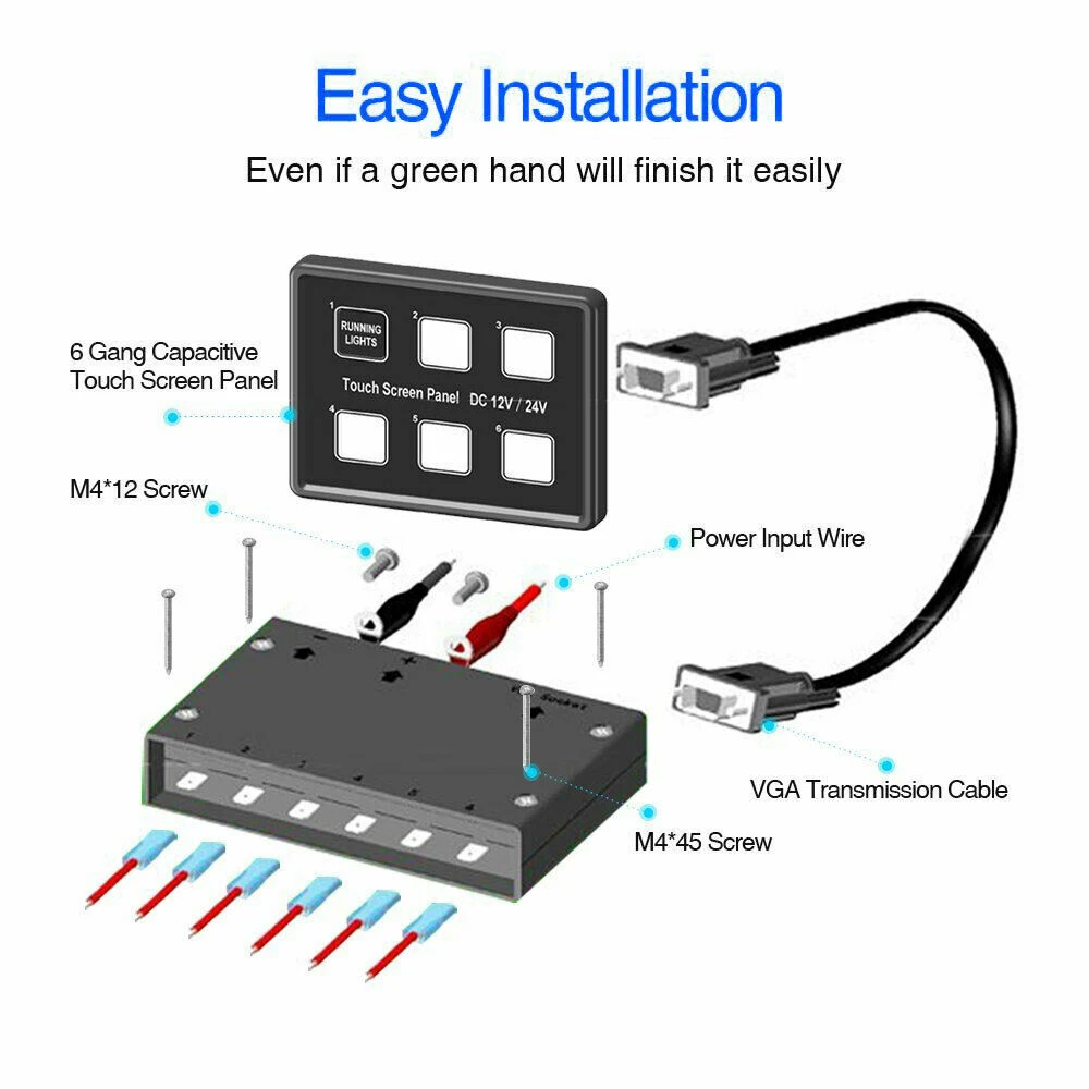 ① 6-полосная емкостная панель сенсорного экрана для тех, у кого за консолью ограничено пространство для установки, и тех, кто ищет Панель переключателей нового стиля, которая уменьшает беспорядок проводки в задней части переключателя! Уникальный, гладкий и компактный.