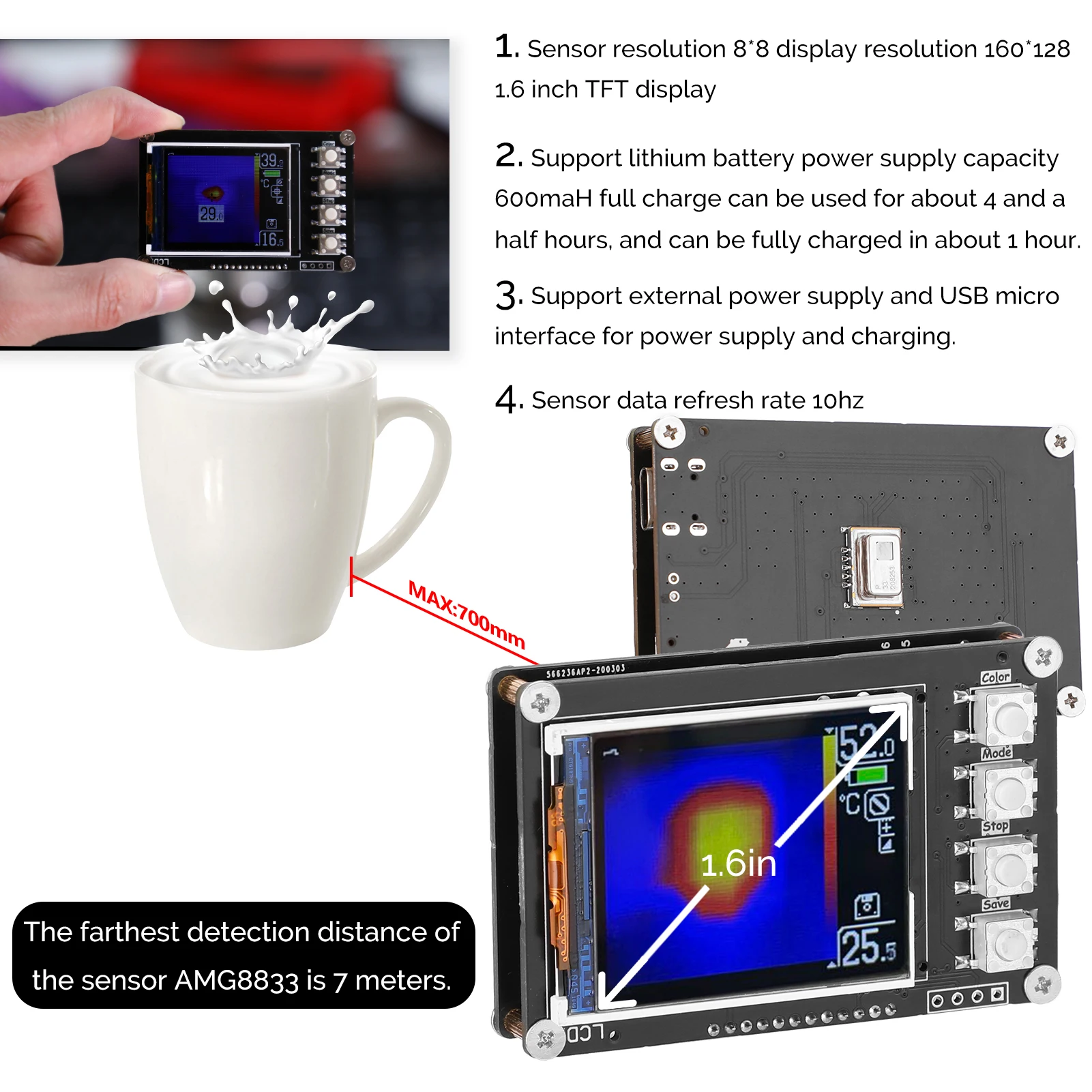 Этот простой тепловизор использует датчики AMG8833, Максимальное Обнаружение ran-ge составляет 7 м. С 1,6 дюймов TFT экран дисплея, вы можете увидеть данные более четко. Приходите и попробуйте, это не подведет вас.