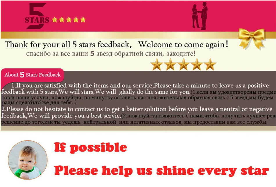 Удовлетворение ваших запросов и положительная обратная связь очень важны для нас. Пожалуйста, оставьте положительные отзывы и 5 звезд, если вы удовлетворены нашими товарами и обслуживанием. Если у вас есть какие-либо проблемы, пожалуйста, не стесняйтесь связаться с нами, прежде чем оставить отрицательный отзывы. Мы сделаем все возможное, чтобы решить любые проблемы и предоставить Вам лучшее обслуживание клиентов.