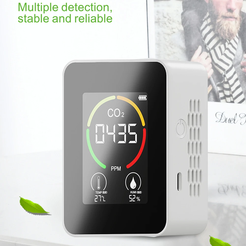 Большой ЖК-экран, различные цвета шрифта отображают различное качество воздуха, зеленый 400-799ppm, желтый 800-1199ppm, оранжевый 1200-1599ppm, красный 1600-1999ppm, 2000ppm выше четырех цветов мигают одновременно.