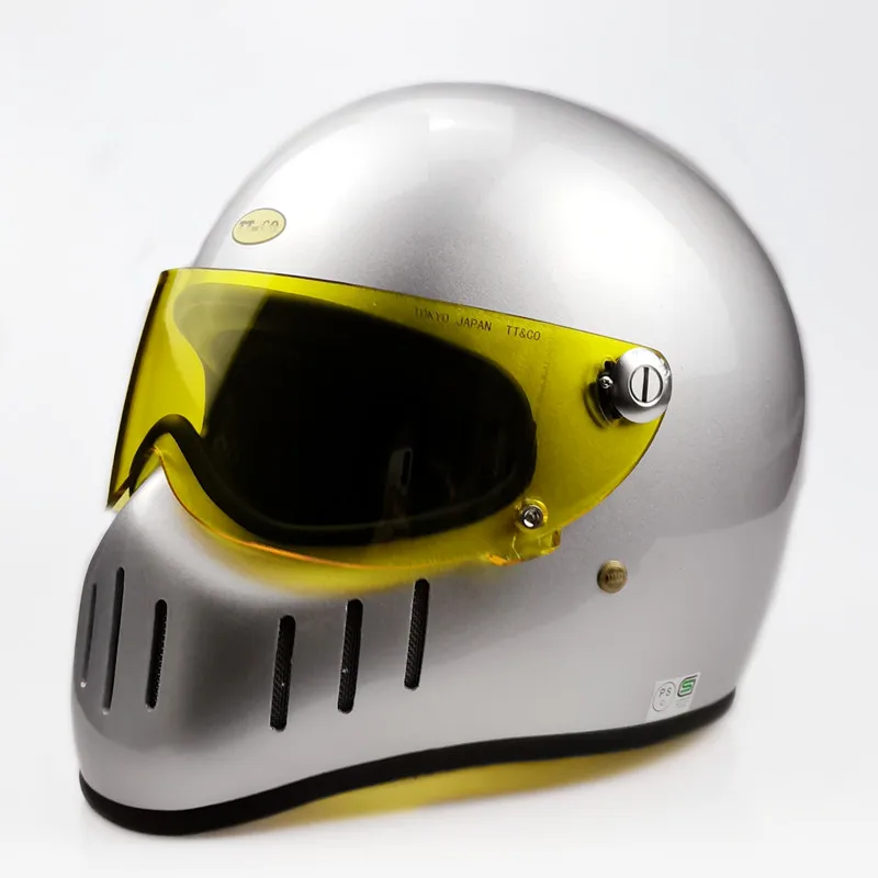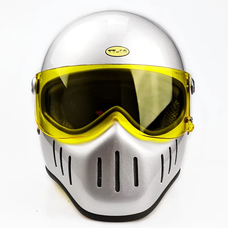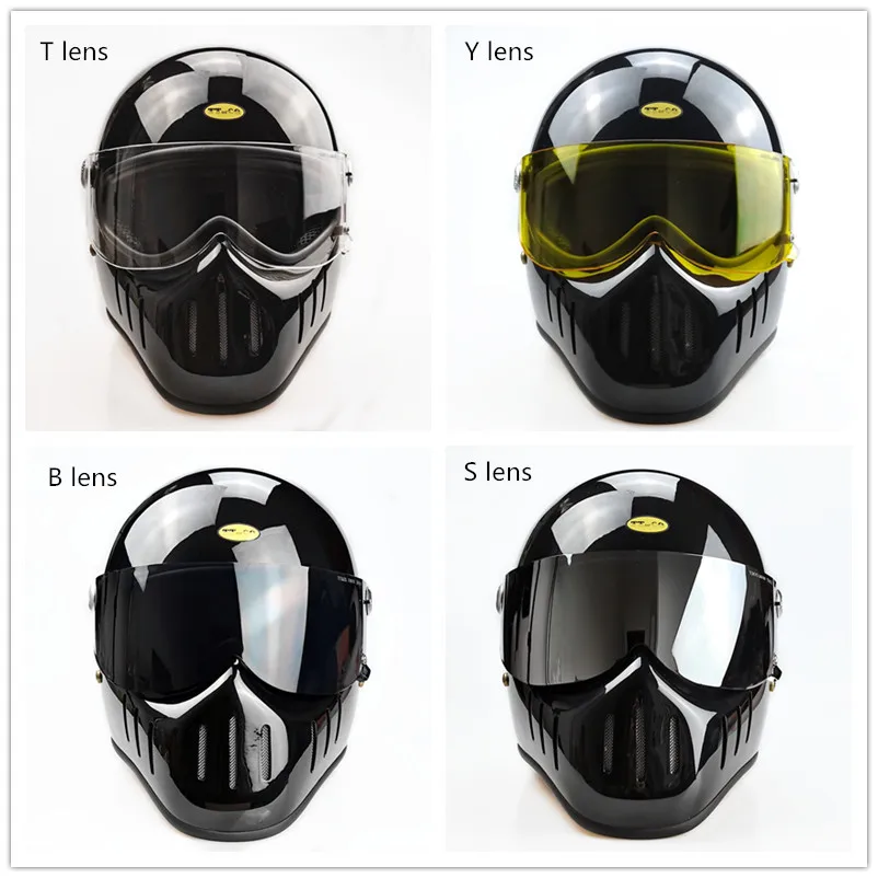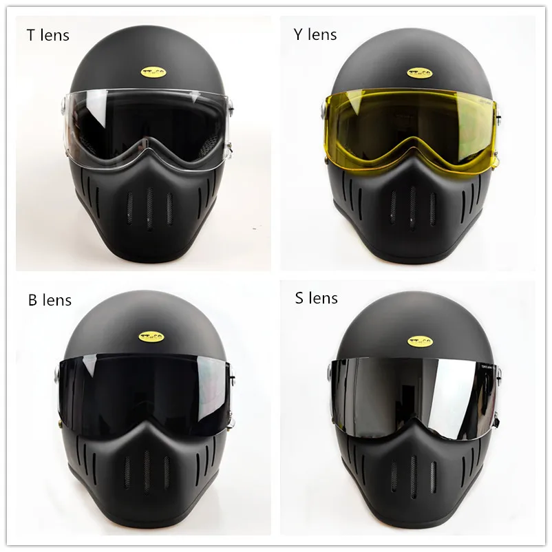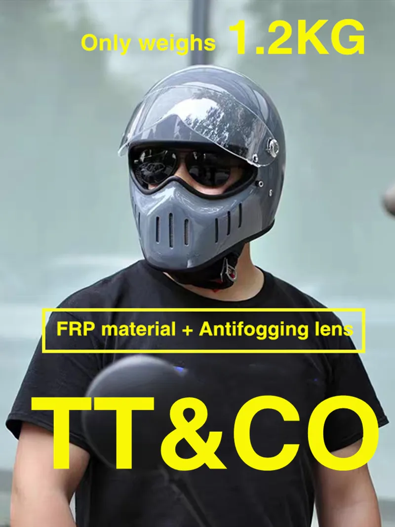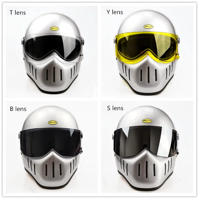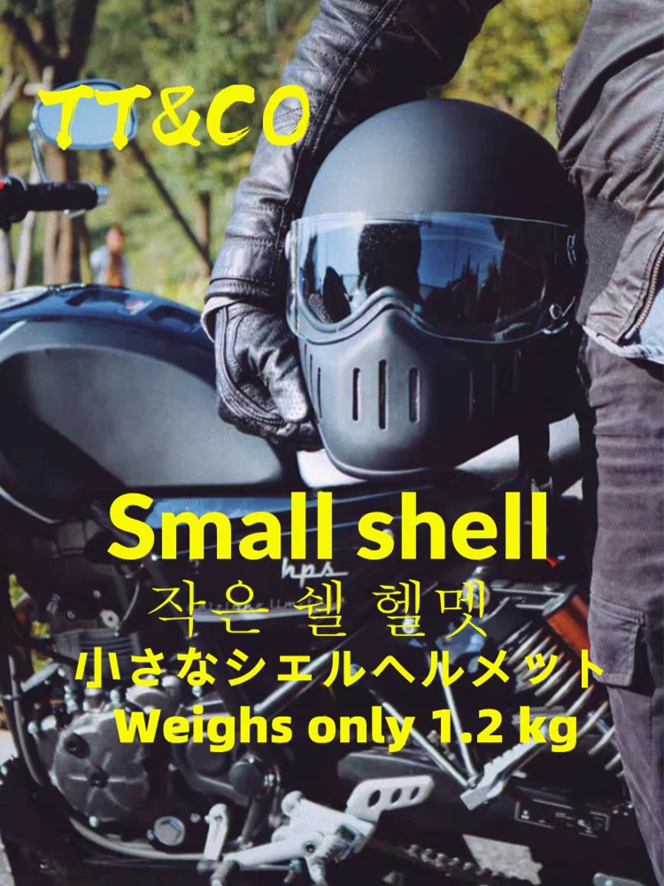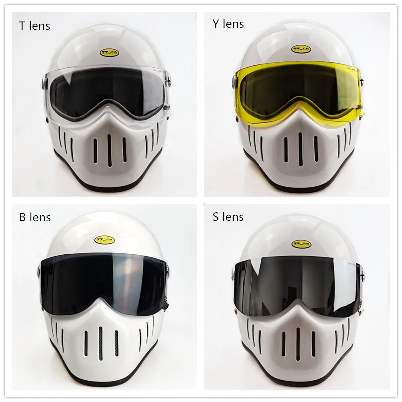 TT & CO классический ретро шлем! Шлем изготовлен из FRP, не дешевые АБС-пластик! Светильник и безопасной! Шлем весит всего 1,2 кг! Объектива против запотевания! Подкладка может быть удалена! Ветрозащитная линза может быть удалена! Есть четыре цвета на выбор, прозрачные линзы (T lens), черные линзы (B lens), желтые линзы (Y lens), серебристые линзы (S lens).