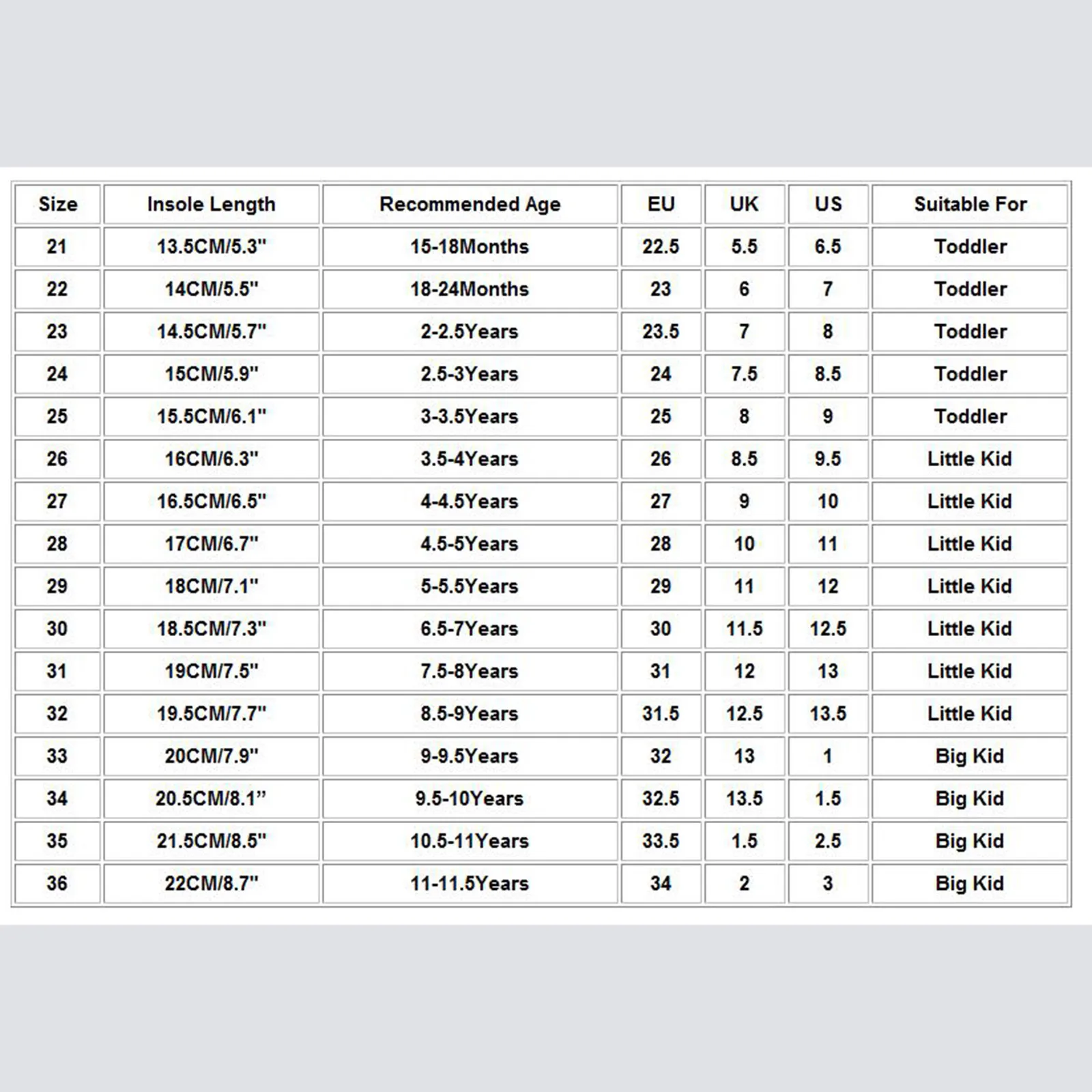 Размер Длина стельки Рекомендуемый возраст ЕС Великобритания США Подходит для 21 13,5 см/5,3" 15-18Months 22,5 5,5 6,5 Для малышей 22 14 см/5,5" 18-24Months 23 6 7 Для малышей 23 14,5 см/5,7" 2-2.5Years 23,5 7 8 Для малышей 24 15 см/5,9" 2,5, для возраста до 3 лет 24 7,5 8,5 Для малышей 25 15,5 см/6,1" 3-3.5Years 25 8 9 Для малышей 26 16 см/6,3" 3,5-4 лет 26 8,5 9,5 Маленький ребенок 27 16,5 см/6,5" 4-4.5Years 27 9 10 Маленький ребенок 28 17 см/6,7" 4,5-5 лет 28 10 11 Маленький ребенок 29 18 см/7,1" 5-5.5Years 29 11 12 Маленький ребенок 30 18,5 см/7,3" 6,5-7 лет 30 11,5 12,5 Маленький ребенок 31 19 см/7,5" 7,5-8 лет 31 12 13 Маленький ребенок 32 19,5 см/7,7" 8,5-9 лет 31,5 12,5 13,5 Маленький ребенок 33 20 см/7,9" 9-9.5Years 32 13 1 Большой ребенок 34 20,5 см/8,1" 9,5-10 лет 32,5 13,5 1,5 Большой ребенок 35 21,5 см/8,5" 10,5-11 лет 33,5 1,5 2,5 Большой ребенок 36 22 см/8,7" 11-11.5Years 34 2 3 Большой ребенок