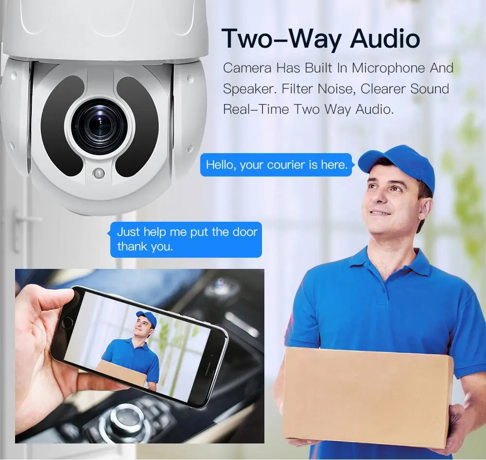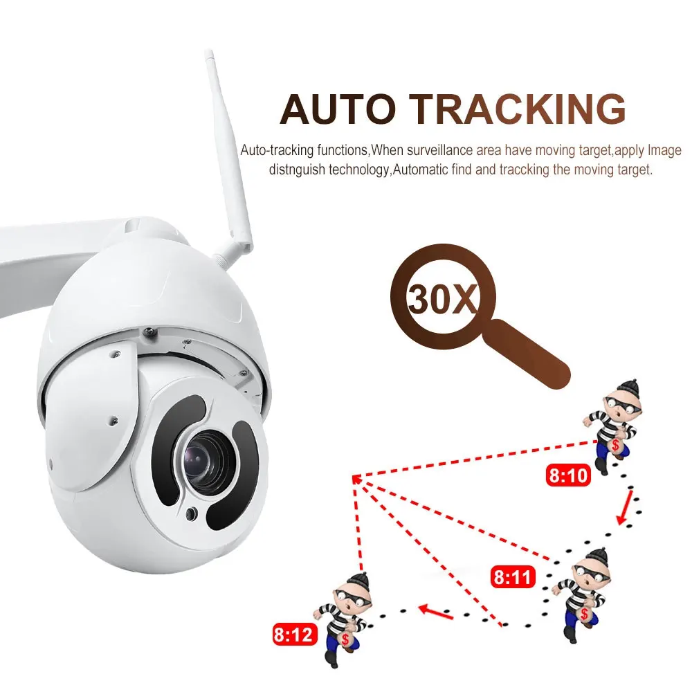 Камера будет регулировать вращение панорамирования/наклона и увеличивать автоматически, захватывая четкие контрольные цели и автоматическое отслеживание движения человека, а также нажимать оповещения по электронной почте или уведомления на ваш телефон.