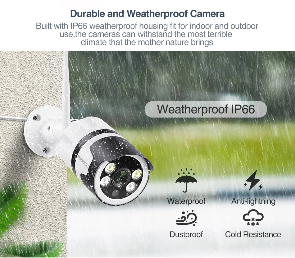 Наружная камера WiFi имеет пылезащитный и водонепроницаемый корпус с прочным металлическим корпусом. Продолжайте запись, независимо от дождя, молнии, запотевания или снега.