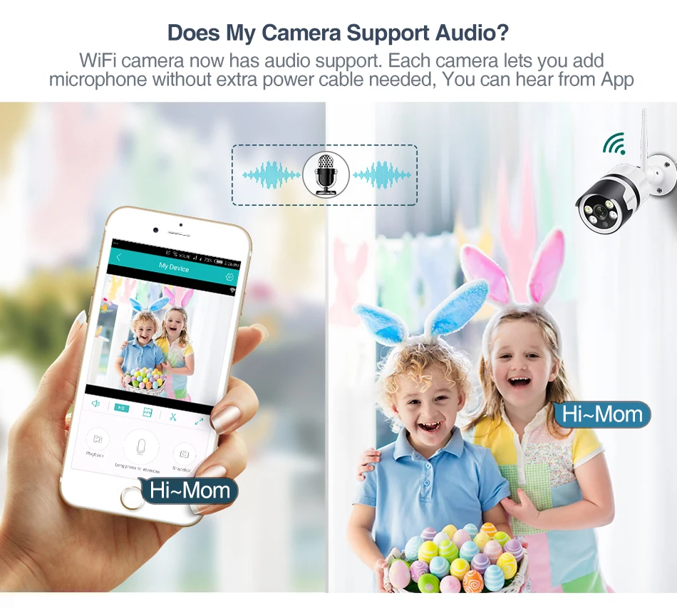 Одновременно Двусторонняя аудиосвязь позволяет видеть, слышать и говорить с семьей, передавать Привет друзьям, разговаривать с почтальоном на стороне камеры в любое время, наблюдать за вашим питомцем в любом месте, или отпугивать любых подозрительных людей.