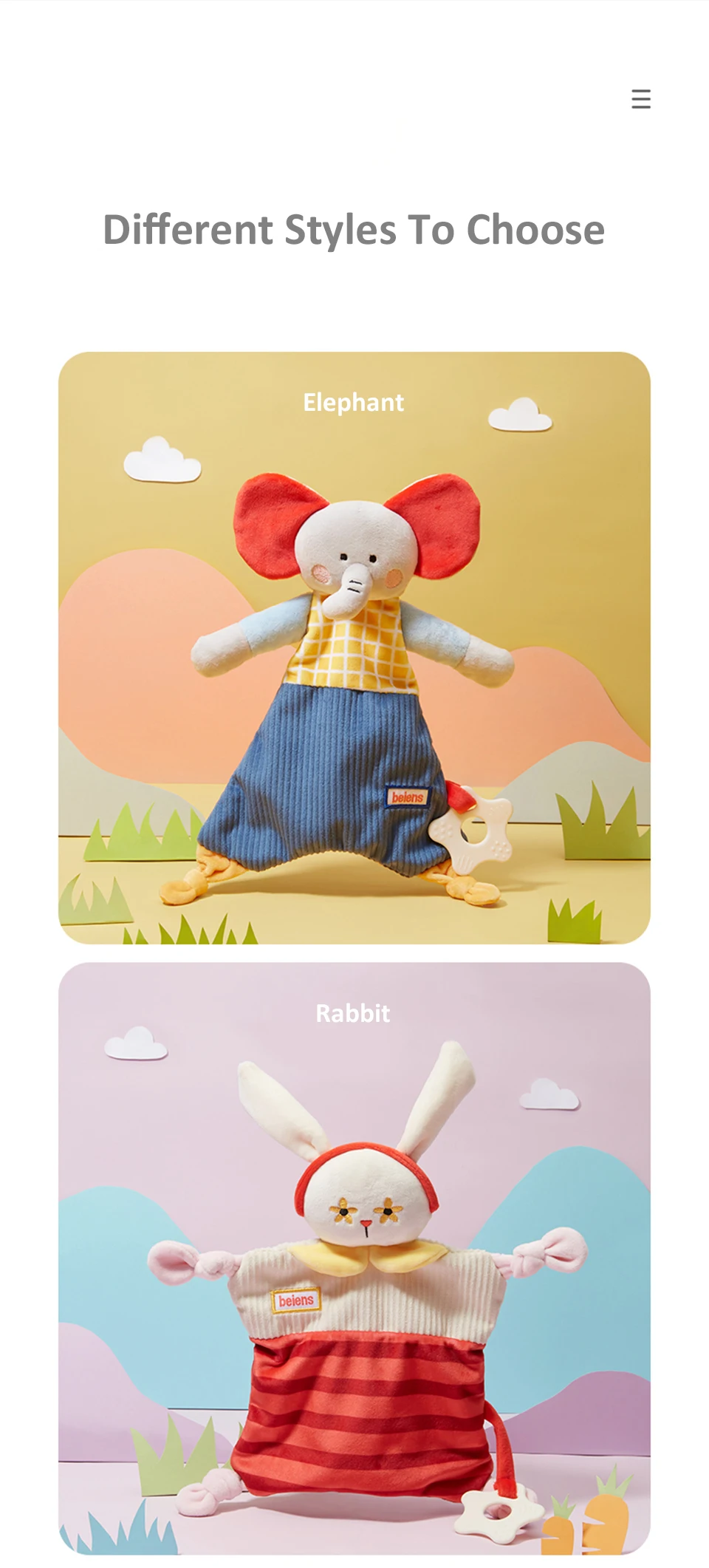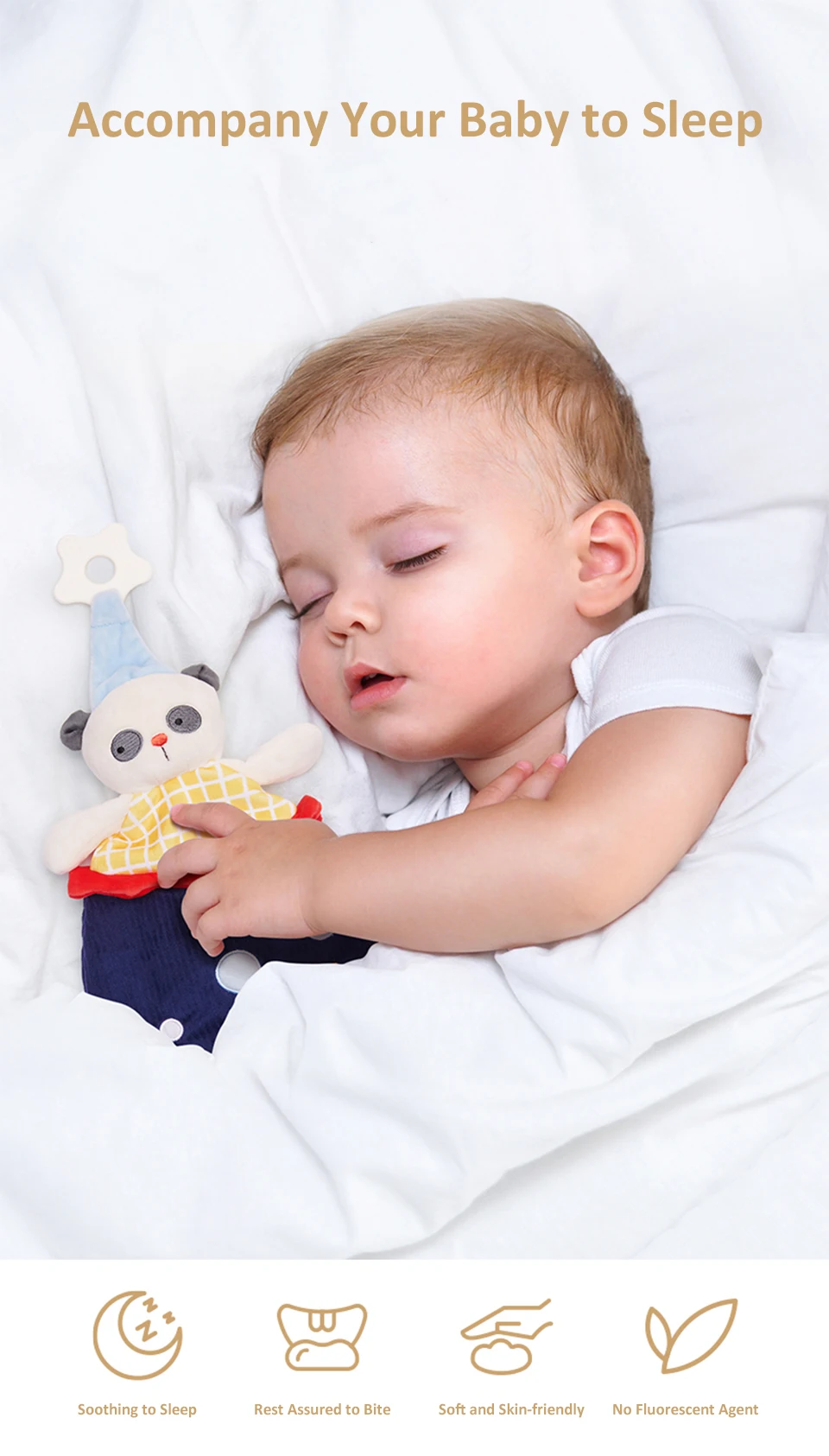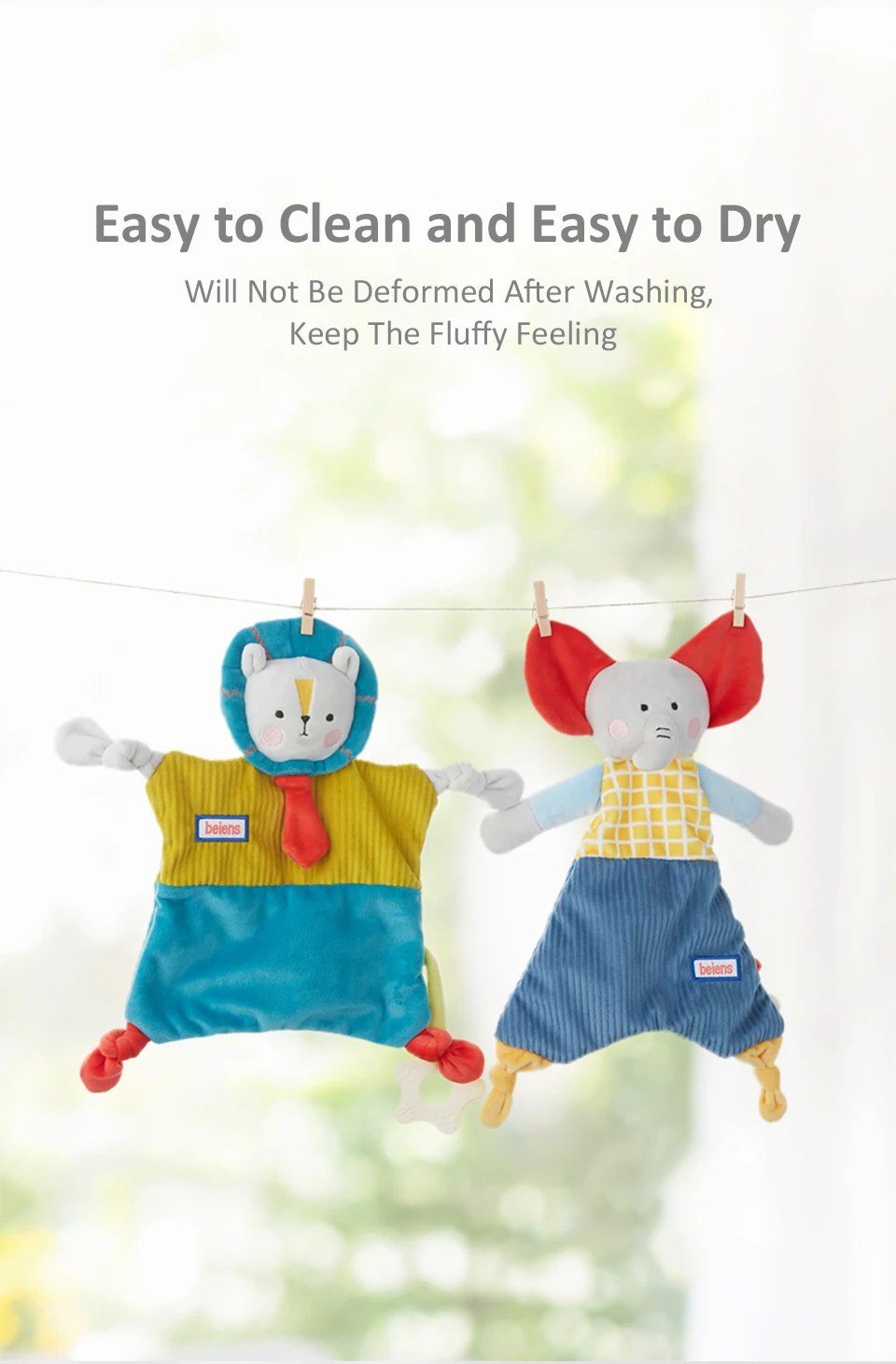 Материал: 100% полиэстер + ТПЭ Упаковка: коробка Стиль: Слон/Кролик/Лев/панда Подходящий возраст: младенцы старше 0 лет Особенности: 1. Изготовлен из высококачественных материалов, мягкий, нетоксичный и прочный. 2. Поставляется с мягкой гуттаперкой для снижения беспокойства ребенка во время прорезывания зубов. 3. Успокаивает ребенка и уменьшает плач 4. Не деформируется после стирки, сохраняет ощущение пышности