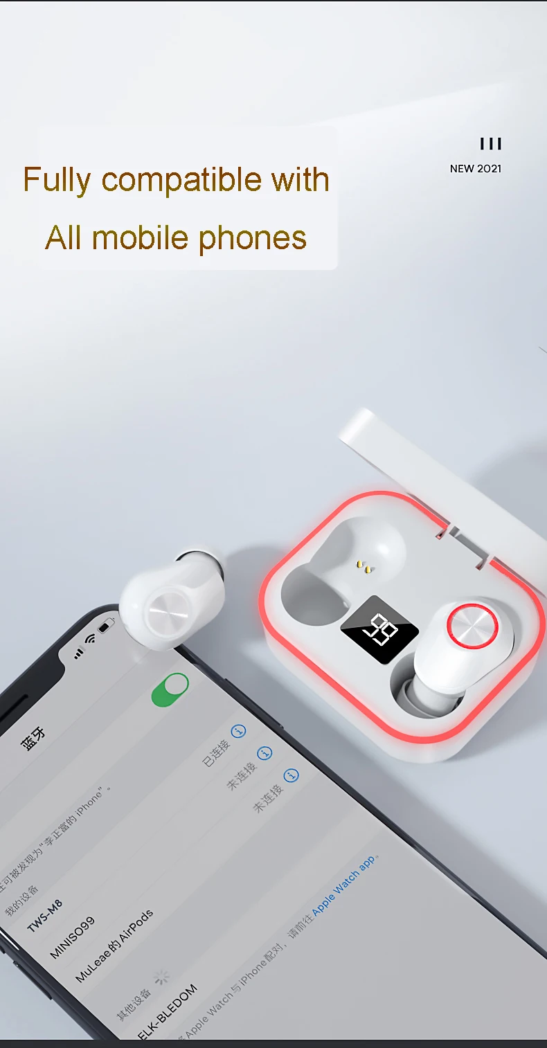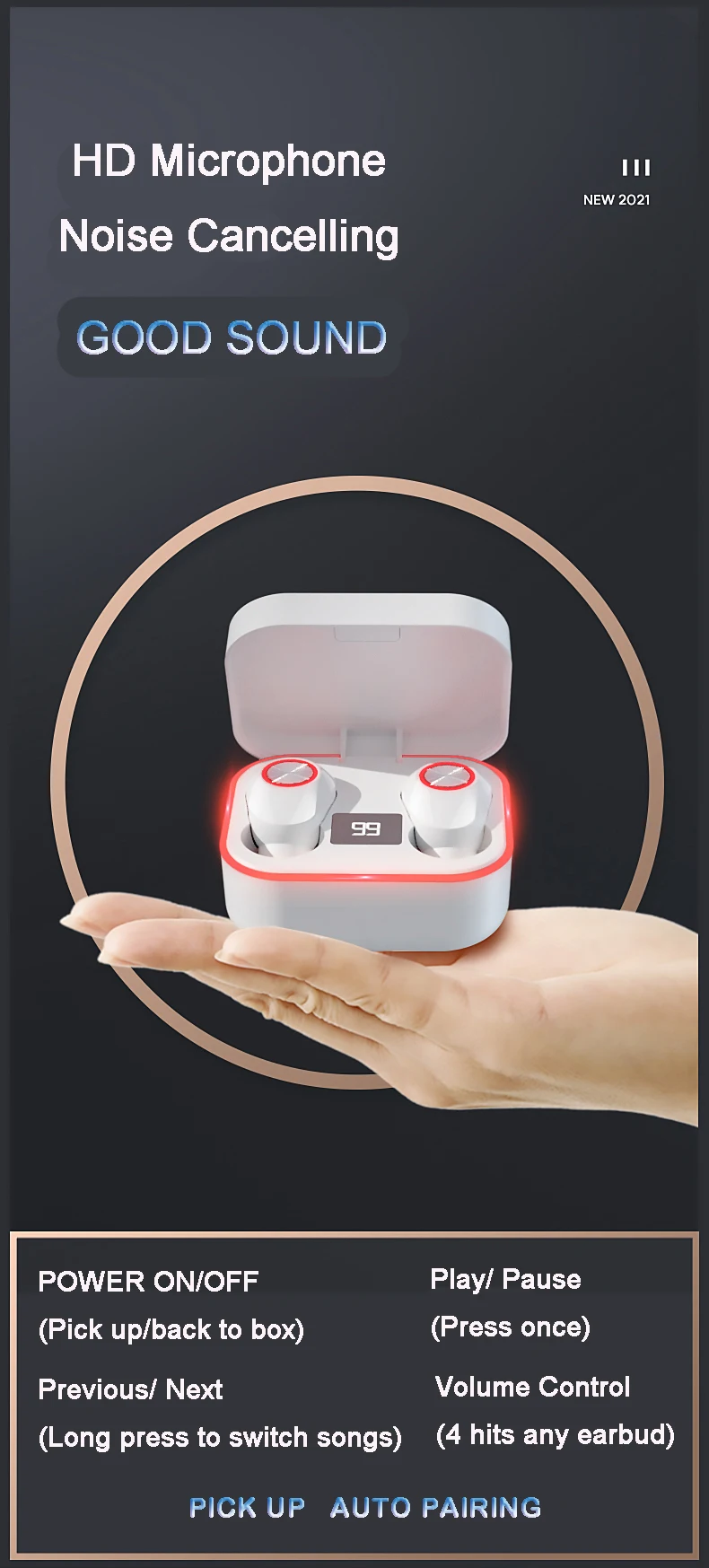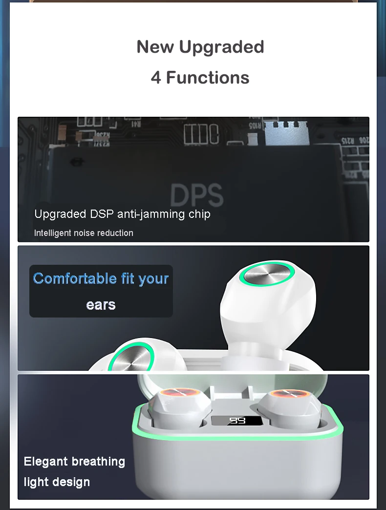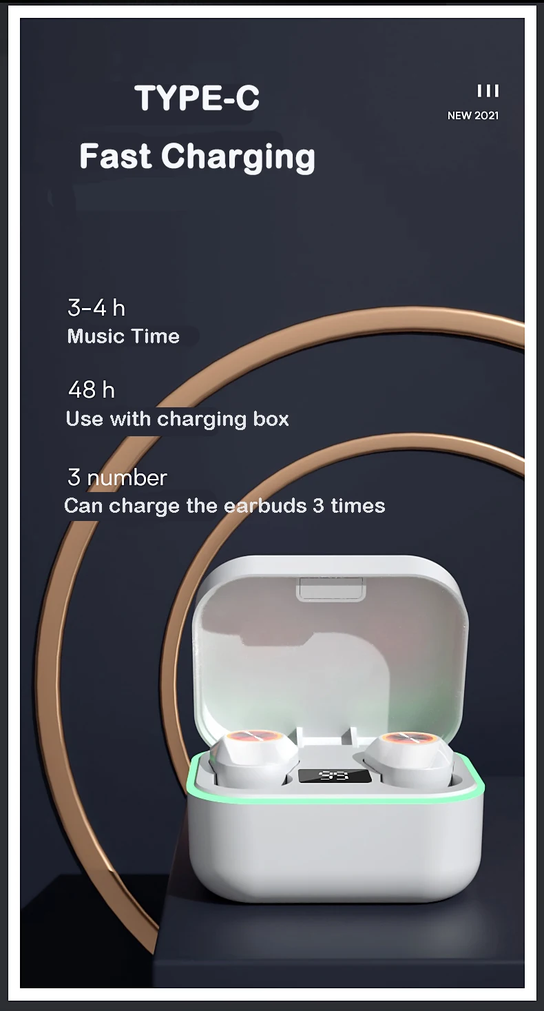 Parameters Bluetooth solution: Zhongke Lanxun 5376 Bluetooth version: V5.0+EDR Wireless frequency: 2.4GHZ Support protocol: A2DP1.3/HFP1.6/HSP1.2/AVRCP1.6/D11.3 Transmission distance: 25 meters Battery capacity: 45mAh/300mAh Charging voltage/current: 5V/1A Play/talk time: about 4 hours Charging time: about 1 hour Standby time: 60 hours Working temperature: -10-50℃ Packing list 2 * Wireless Earphone 1 * Charging Box 1 * Charging Cable 1 * Use Manual in English (Free nice GIFT during Order Date of Dec 25th- Jan 31st)