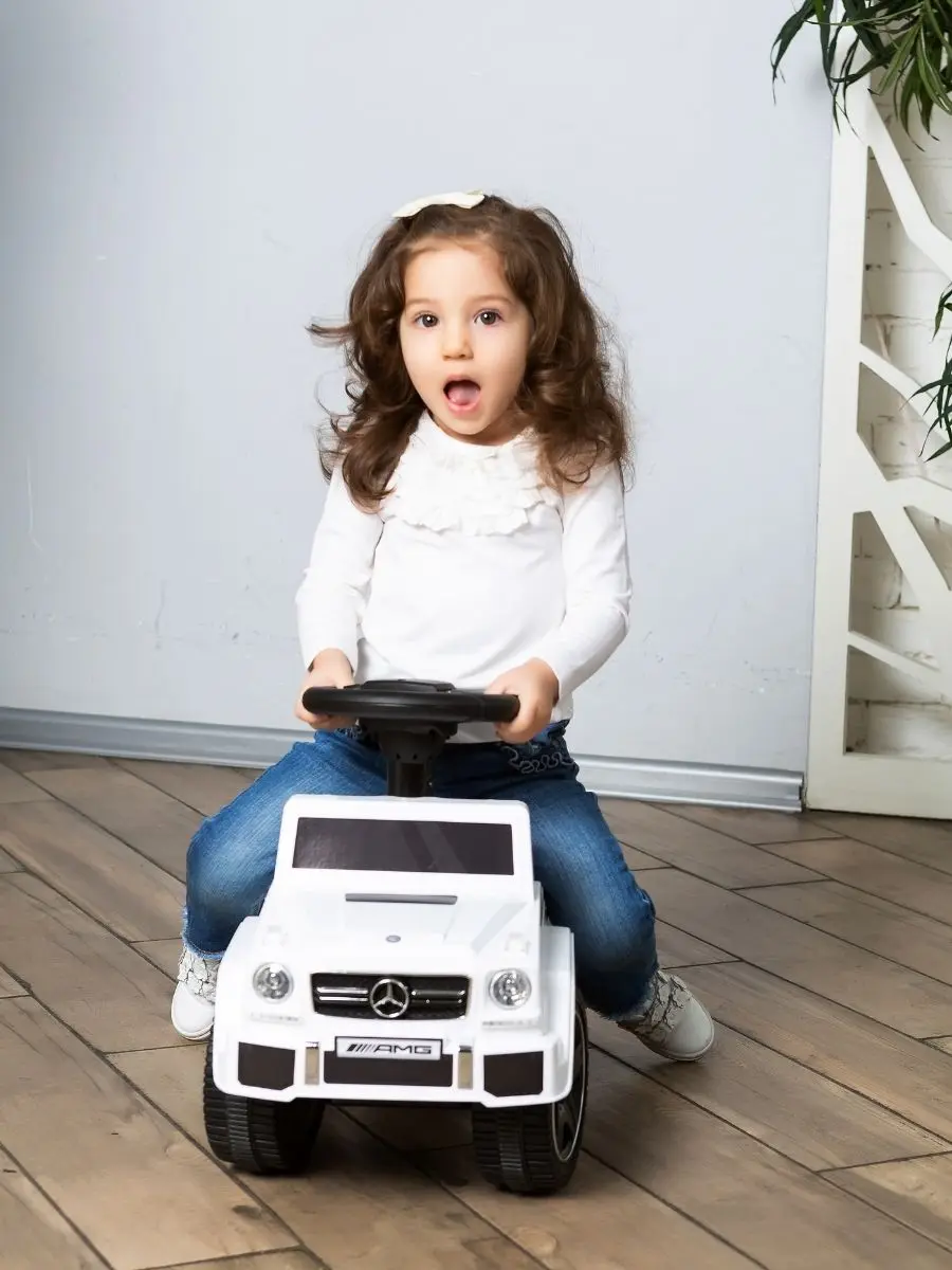 Каталка Mercedes Benz G63 выполнена по лицензии знаменитого немецкого бренда, имеет фирменные черты и элементы автомобиля. Вот почему модель выглядит так реалистично и очень брутально. Внутреннее содержание ничуть не уступает солидному внешнему виду. Каталка имеет музыкальный руль и панель со встроенными мелодиями, USB-разъемом и линейным входом AUX. Это значит, что в любой момент вы сможете подключить флешку, телефон или плеер со своей музыкой. Так первое путешествие станет намного интереснее! Малыши, которые только учатся ходить, смогут держаться за спинку и делать свои первые шаги. Дети постарше смогут отталкиваться ножками и передвигаться самостоятельно. Стопор сзади защищает машинку от опрокидывания. Колеса выполнены из пластика, за счет чего каталка имеет небольшой вес и с легкостью будет путешествовать с вами.