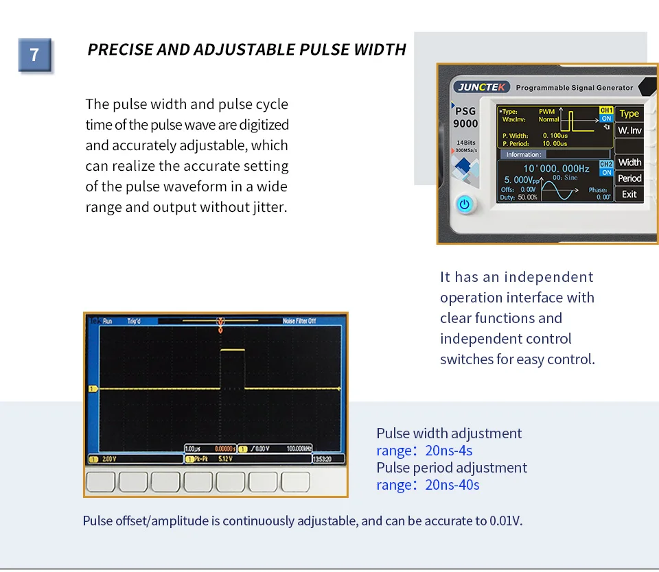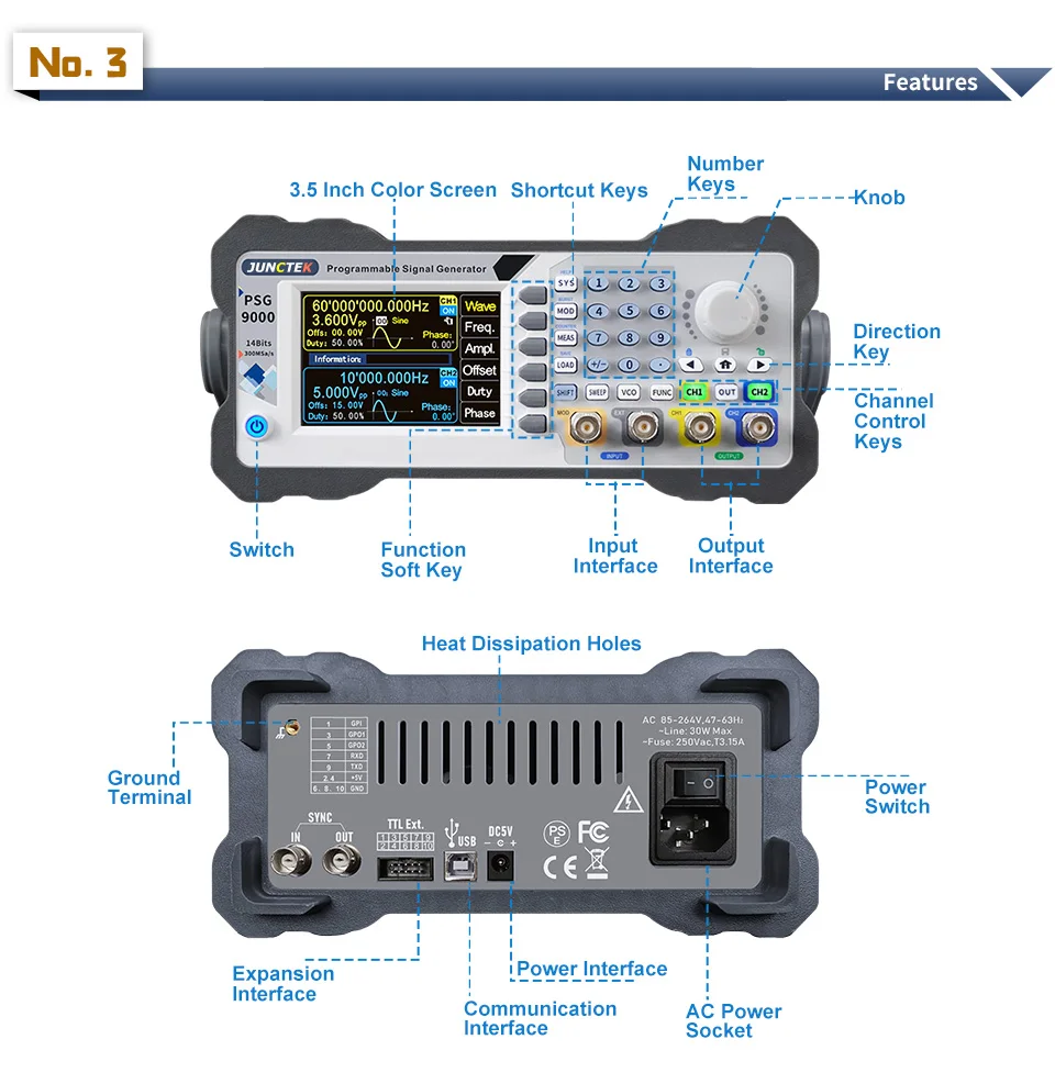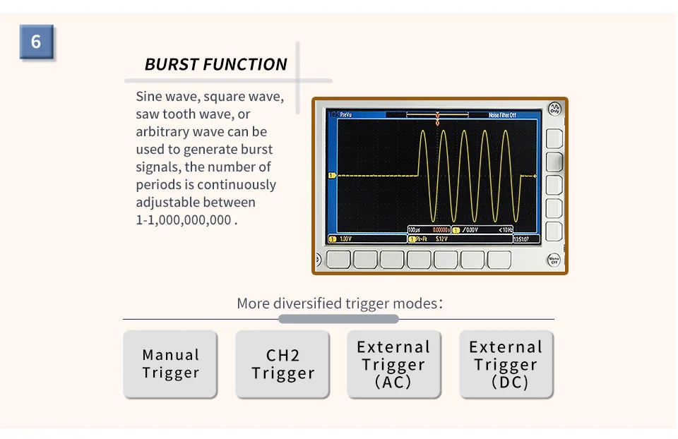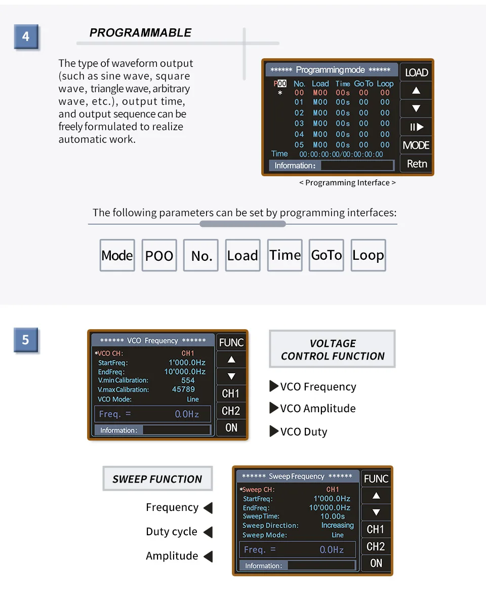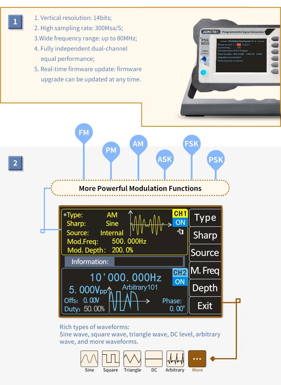 Синусоидальная волна, квадратная волна, импульсная волна (отношение мощности, ширина импульса и время цикла могут быть точно установлены), треугольная волна, восходящая пандус, падающая пандус, CMOS волна, уровень постоянного тока, половина волны, полная волна, положительная ступенчатая волна, обратная лестница волна, экспоненциальный подъем, экспоненциальная осень, Lorentz импульсная волна, мультизвуковая волна, случайная волна шума, трапециевидная импульсная волна, синкерная импульсная волна и 99 наборов пользовательских форм.
