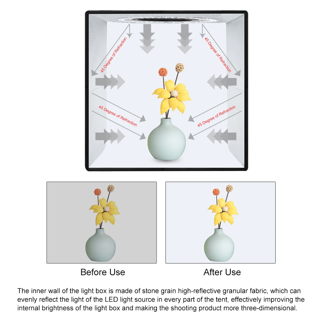 4. Портативный складной дизайн, проще в установке и переноске, Встроенный светодиодный светильник, обеспечивает средний Светильник, предотвращает появление теней и отражения на фотографии.