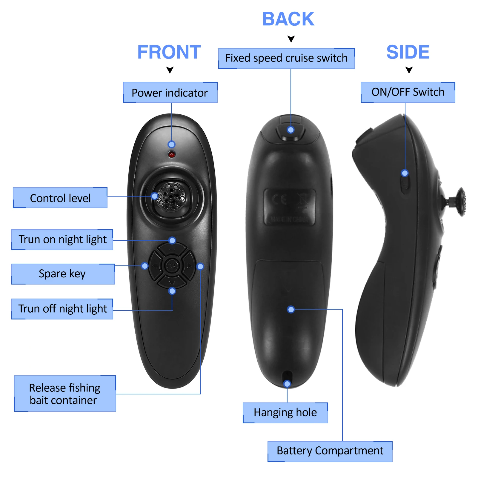 Wireless control and fixed speed cruise switch,make it possible to release bait far. (Remote Range: 500m/540yards)