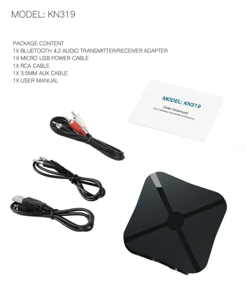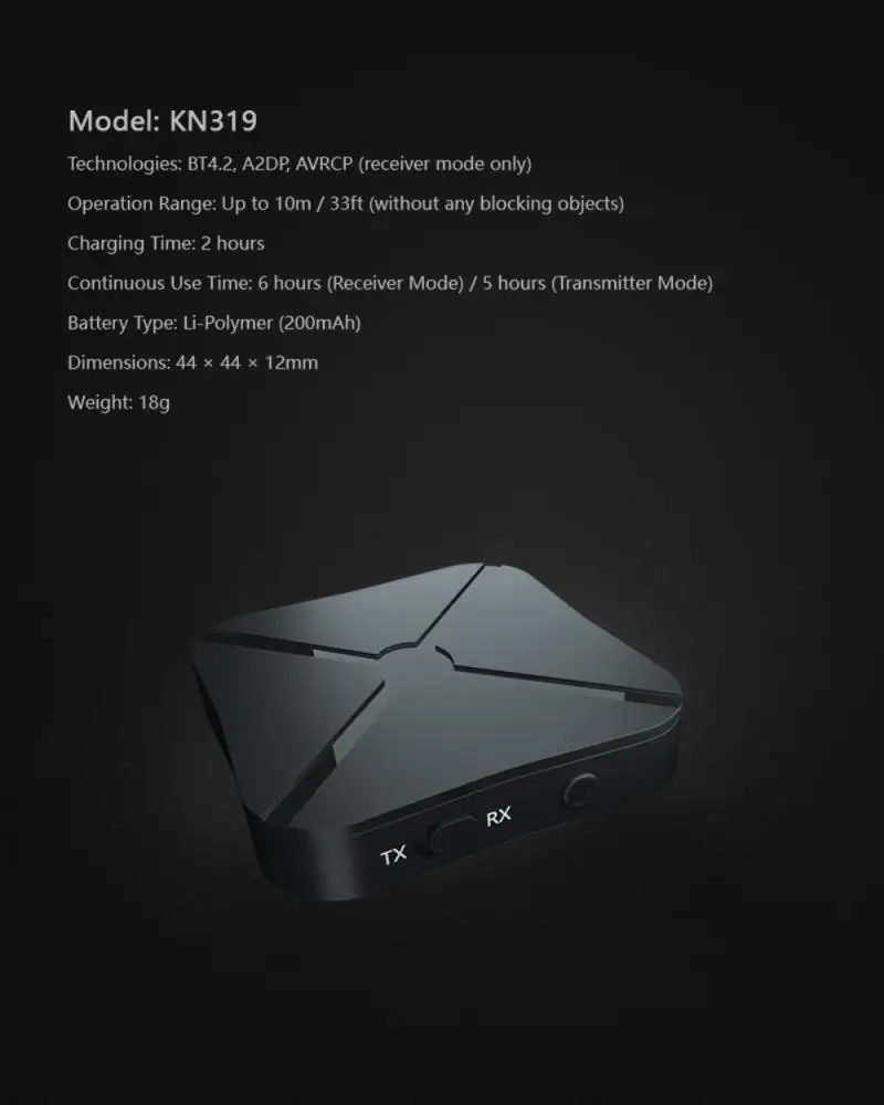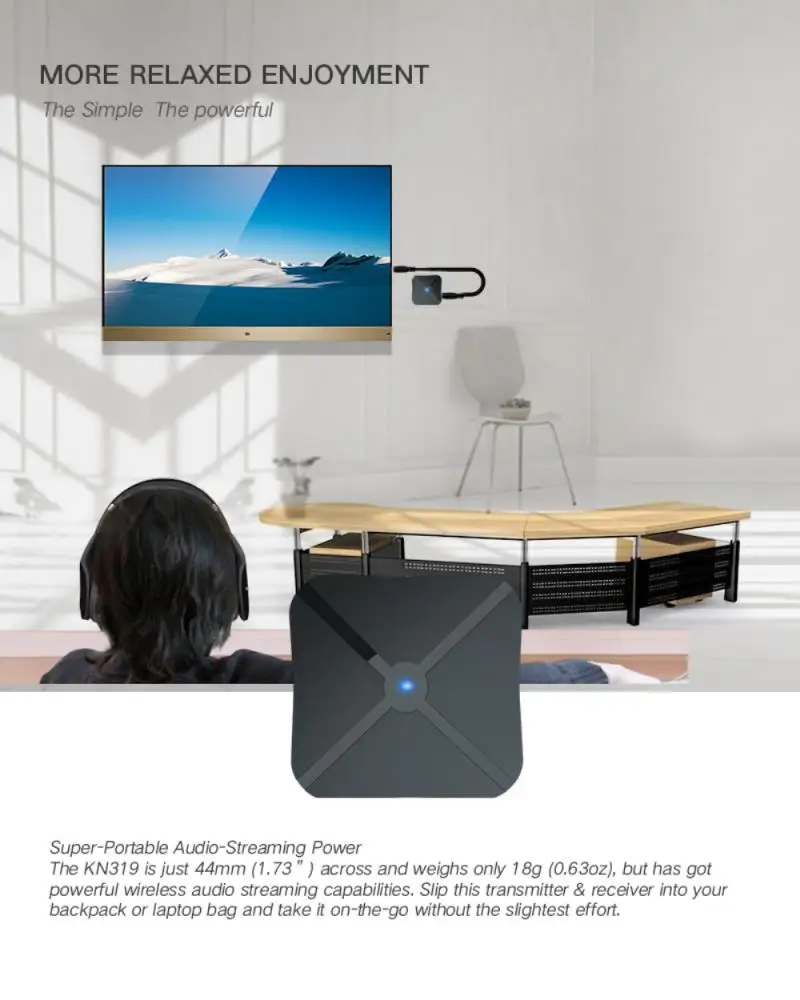 KN319 всего 44 мм (1,73 дюйма) и весит всего 18 г (0,63 унций), но имеет мощные возможности беспроводной потоковой передачи аудио. Вставьте этот передатчик и приемник в рюкзак или сумку для ноутбука и возьмите его на ходу без каких-либо усилий.