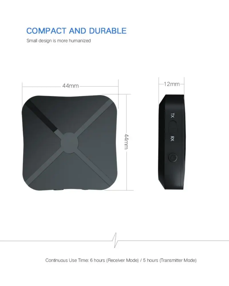4. Переключение между режимами передатчика и приемника с простым щелчком переключателя. Легко подключить, используя передовые технологии Bluetooth и 3,5 мм аудио кабель (все указанные аккумуляторы входят в комплект поставки).