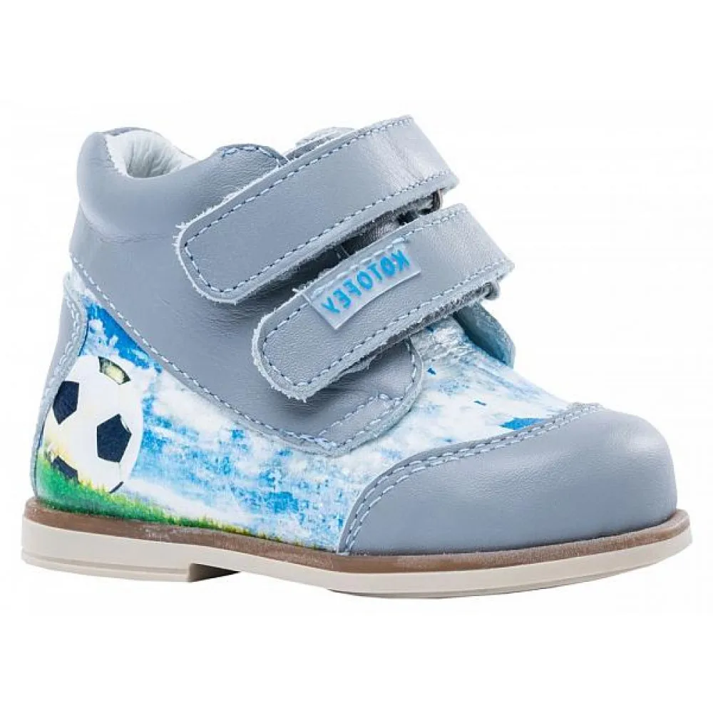 Ботинки представлены в модном сером цвете с красочным футбольным принтом.