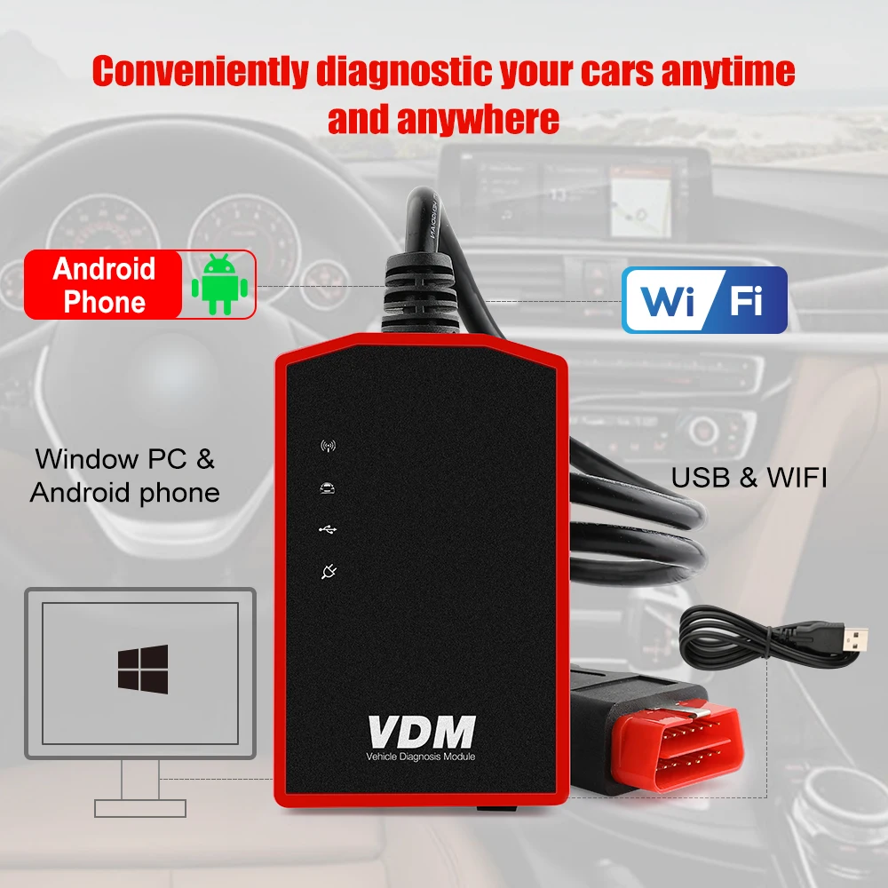 3.Support 2 kinds of connection methods: USB and WiFi, work with computer through USB and WIFi with VDM adapter, not only support traditional stable USB connection, but also support wireless WIFI diagnosis, leading the trend of car diagnosis.