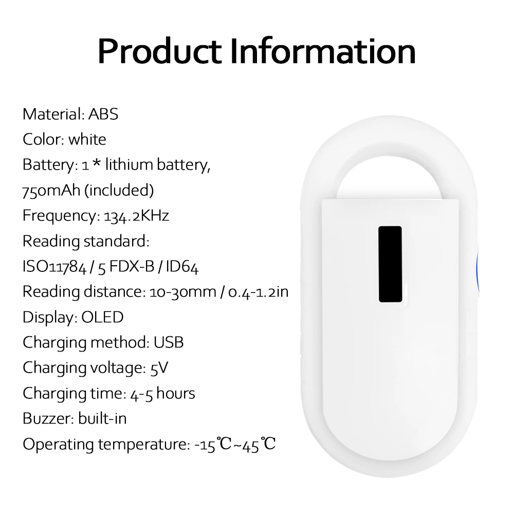 Reading distance: FDX-B ear tag reading distance 100mm, glass tube reading distance 50mm (depending on chip size)