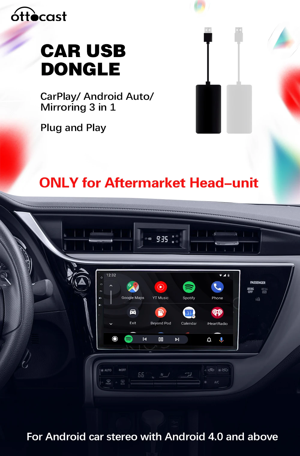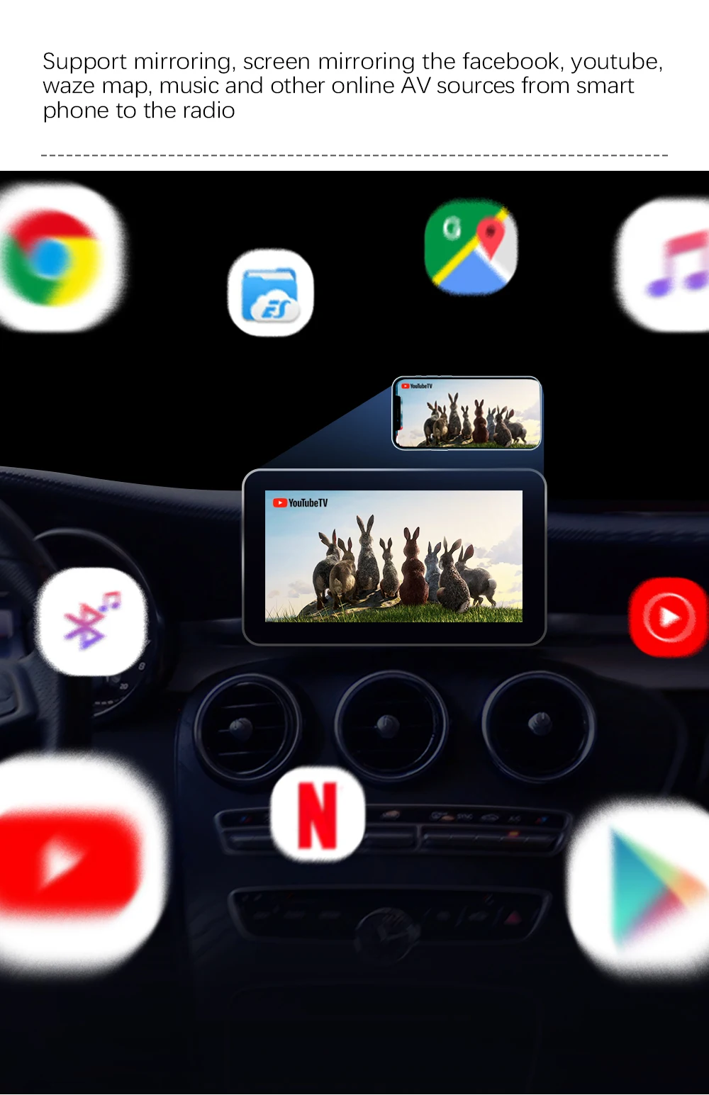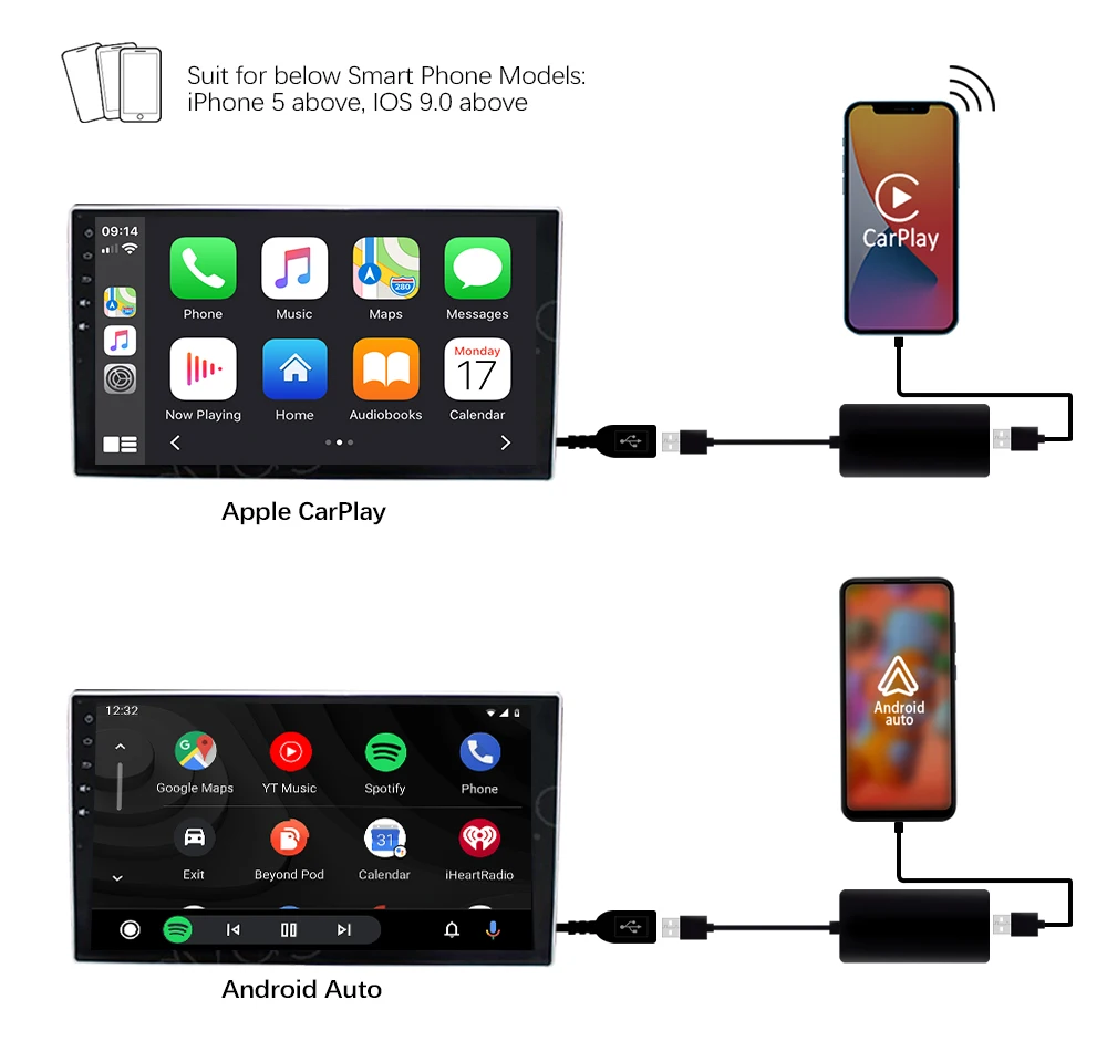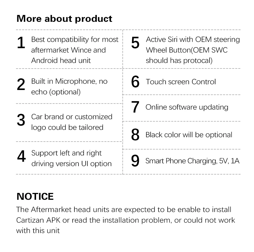 1. Подходит для iPhone с iOS 8.1.1 и выше, iPhone 5 или выше. 2. Подходит для телефонов Android с Android 4,3 и выше. 3. Подходит для автомобильных стереосистем Android 4,0 и выше. 4. Поддержка голосового управления Siri & Ok Google, чтобы получать указания, совершать звонки, отправлять и получать сообщения и т. д. 5. Простая установка. Подключи и работай.