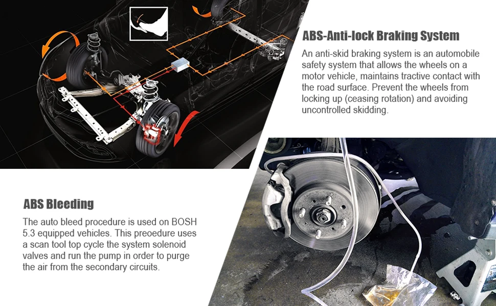 Считывает и очищает коды и выключает предупреждающий индикатор подушки безопасности ABS. Показывает реальные данные ABS, такие как скорость каждого колеса, данные датчиков ESP, данные тормозов и сигналов.