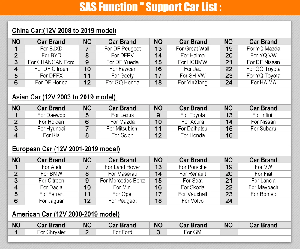 Для Lancia, для Land Rover, для Lexus, для Maserati, для Maybach, для Mazda, для Mercedes Benz, для Mini, Для Mistubishi, для Nissan, для Opel, для Peugeot, для Renault, для Romeo, для Scion, для Seat, для Skoda, для Subaru, для Toyota, для Vauxhall, для Volvo, для VW